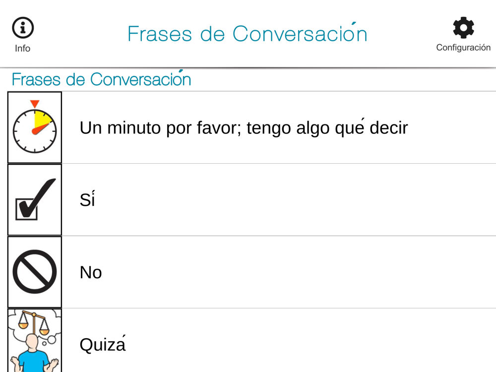 SmallTalkä Frases de Conversación proporciona una biblioteca de imágenes que puedes tocar que hablan en voz alta. Esto incluye palabras y frases comunes como saludos, respuestas, solicitudes y declaraciones sobre el bienestar. Es perfecto para conversar con amigos, familiares y otras personas.