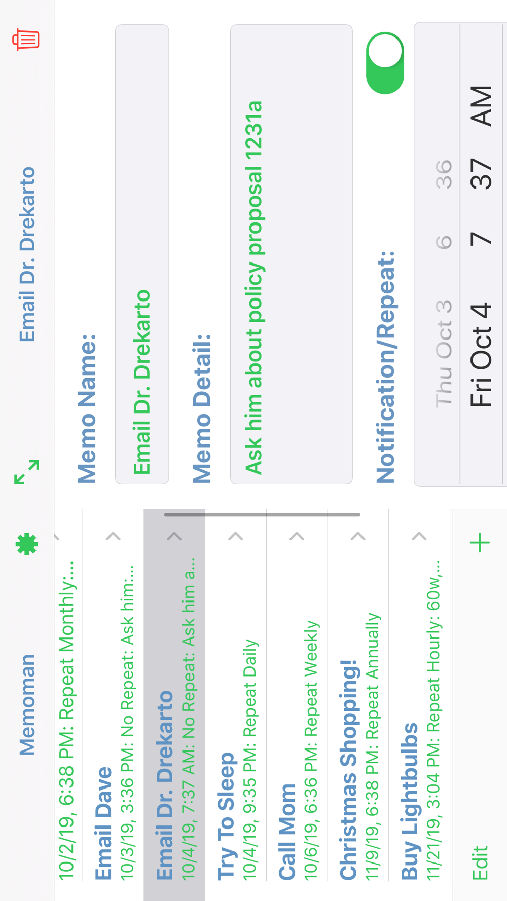 With Memoman you can create memos and be reminded with push notification that repeat (or don't), nagging you to get stuff done. Never miss a deadline again with Memoman! Reminders happen whether or not you have internet. That's reliable. View your memos in Notification Center and just tap on them to open the app! Delete or mute a memo right from the notification anywhere with interactive notifications! Memoman lives on your wrist too with Apple Watch support. Get your life together and get Memoman!