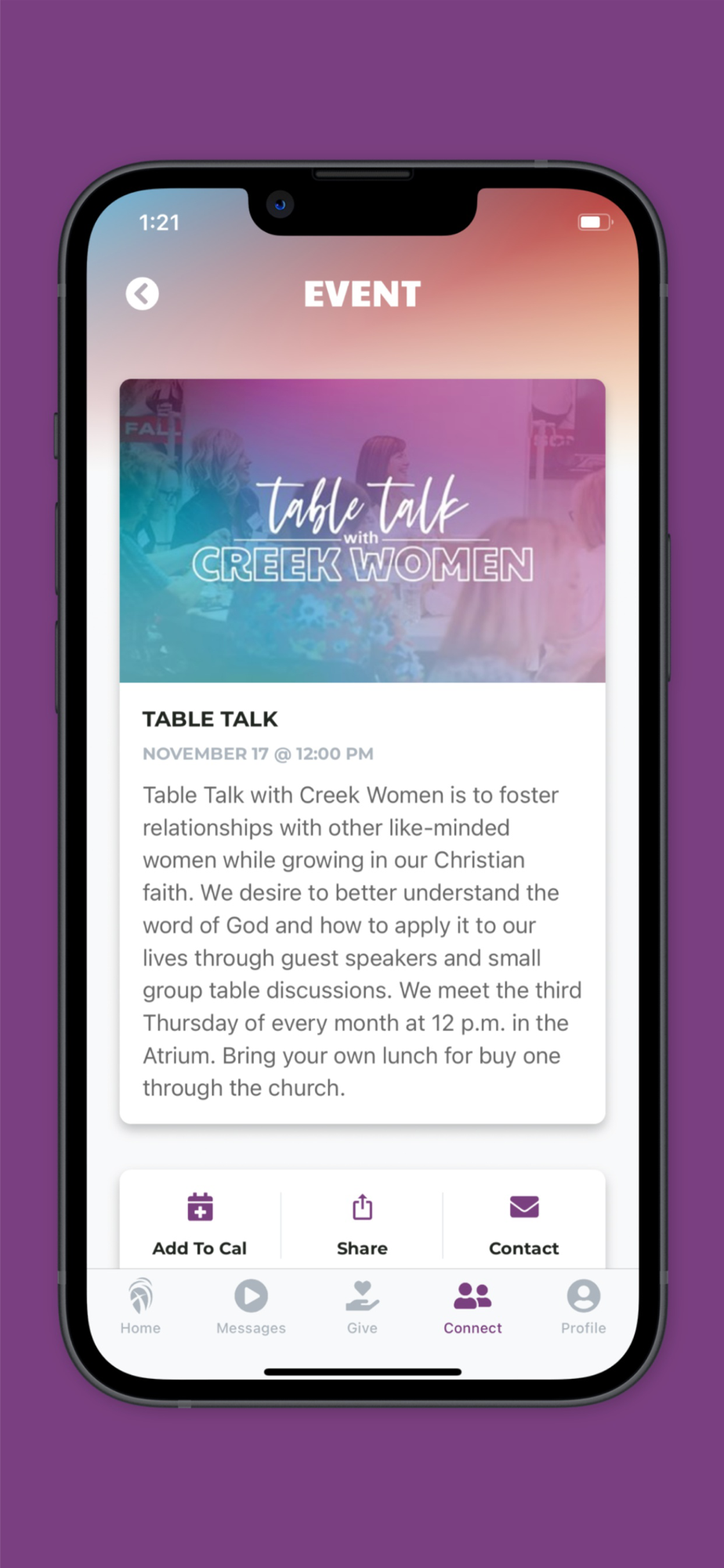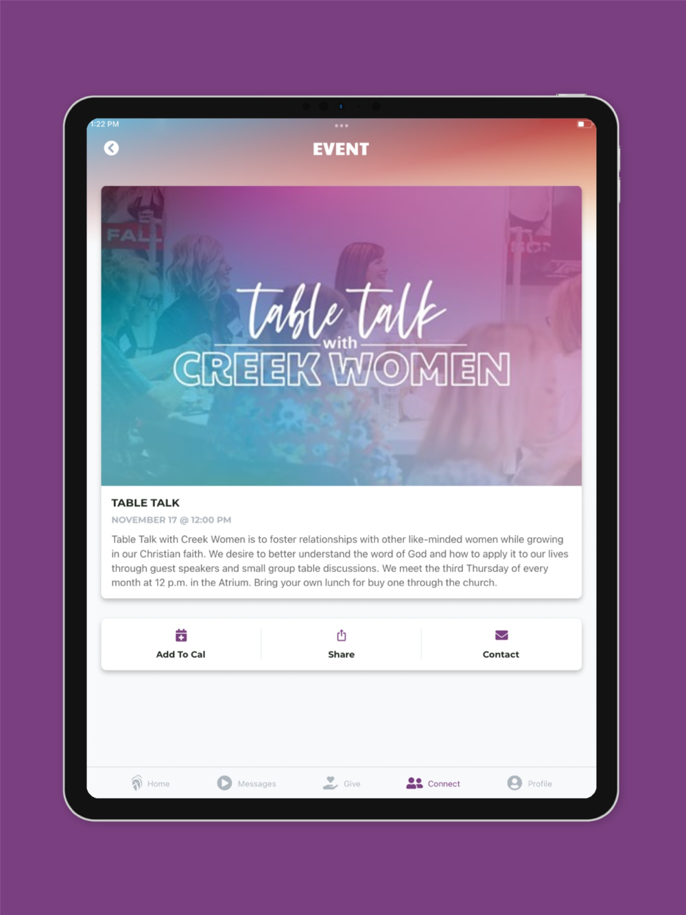 No matter where you are, or how you connect, download the Creek App to stay up to date on all things at Cottonwood Creek Church.
