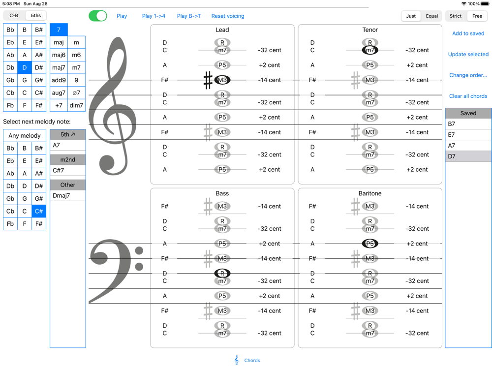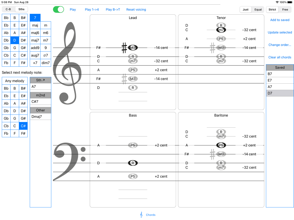 You can hear how a chord sounds in different voicing by just tapping the note symbols. BarberChords will inform you if any chord intervals are left out. Select "Free" mode (instead of "Strict") to get a wider selection of notes.