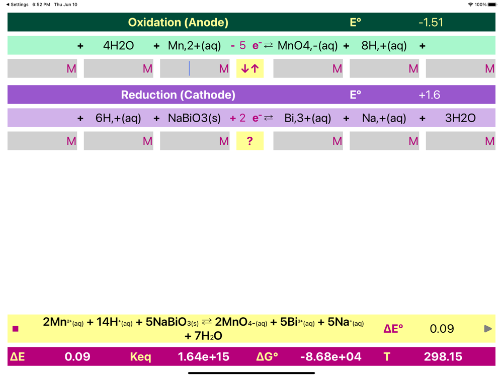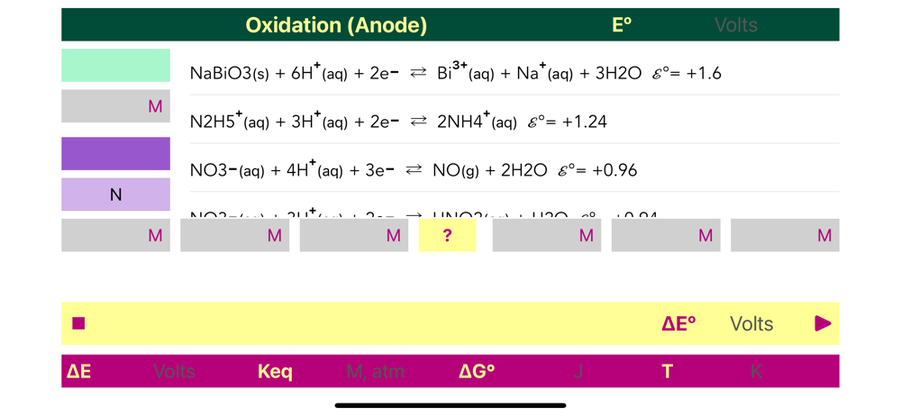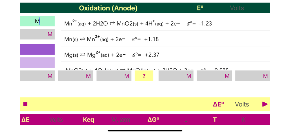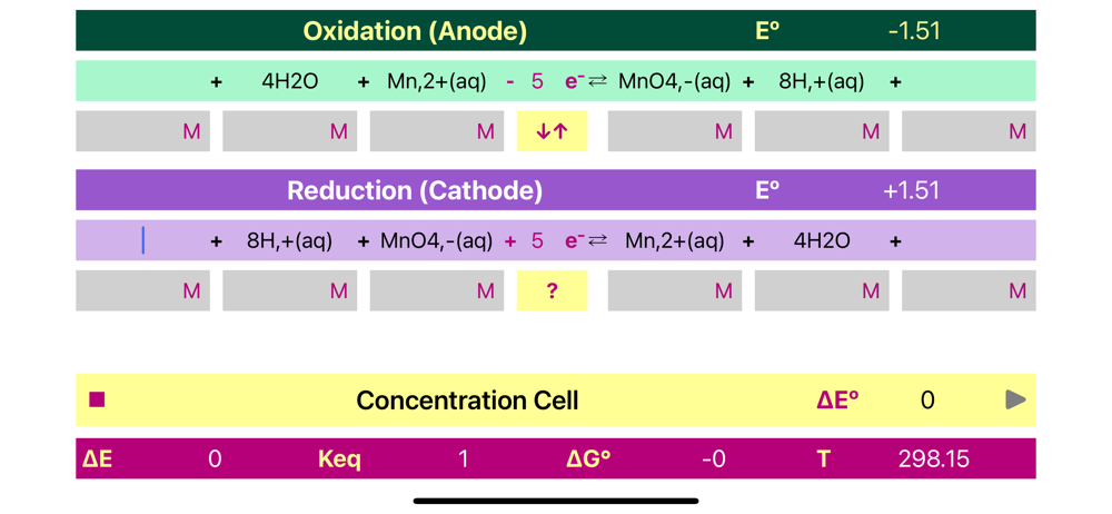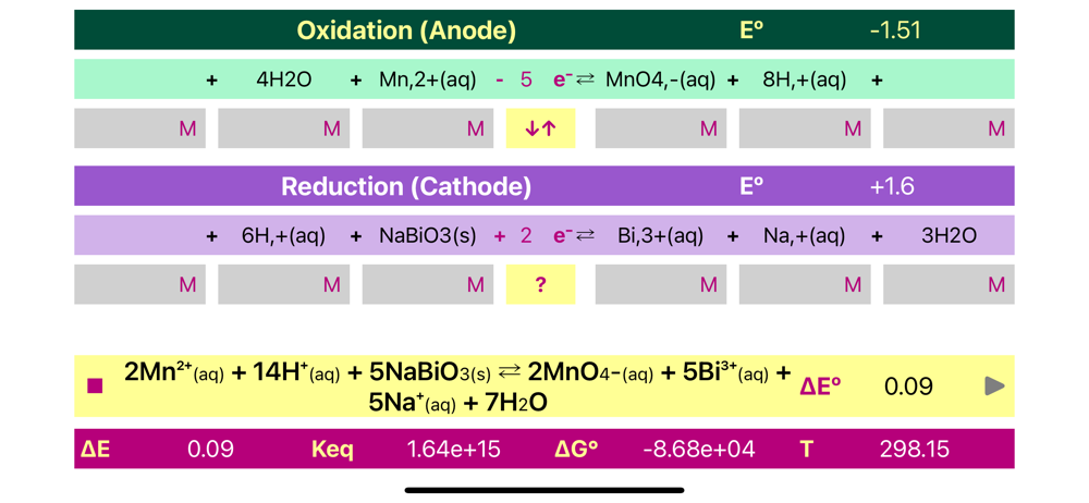 Electrochemistry is a tool for parameterization of oxidation-reduction reactions and electrochemical cells. The app helps to balance and combine a standard half-reactions into a single redox equation and to find the overall standard potential, equilibrium constant, standard free Gibbs energy and total voltage. The app includes redox reactions database, that automatically suggests and inserts reactions upon typing.