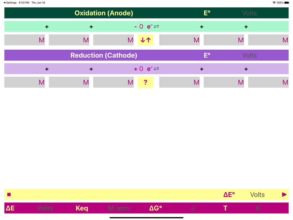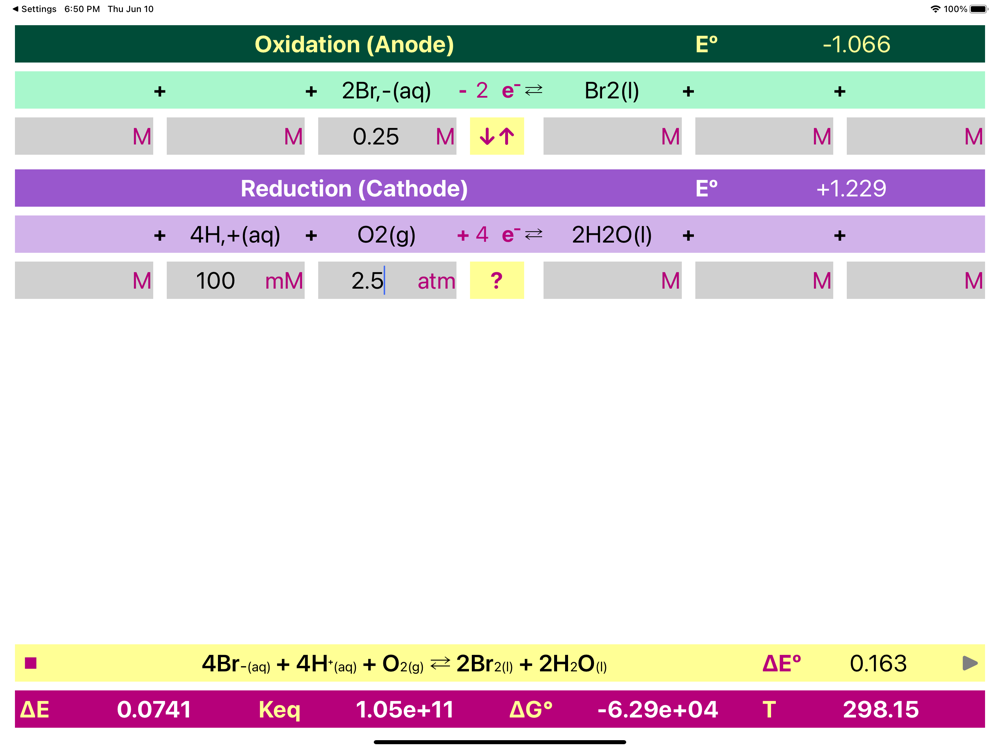 Voltage and potentials units are Volts only, Energy units are Joules, Temperature is in Kelvin only. Concentration units are adjusted by tapping the respective fields. If the compound is gas, then units should be set to "atm" and value should be adjusted appropriately. Solids and water are usually not taken into consideration for calculation of equilibrium constant, therefore they "concentration" fields must be left empty.