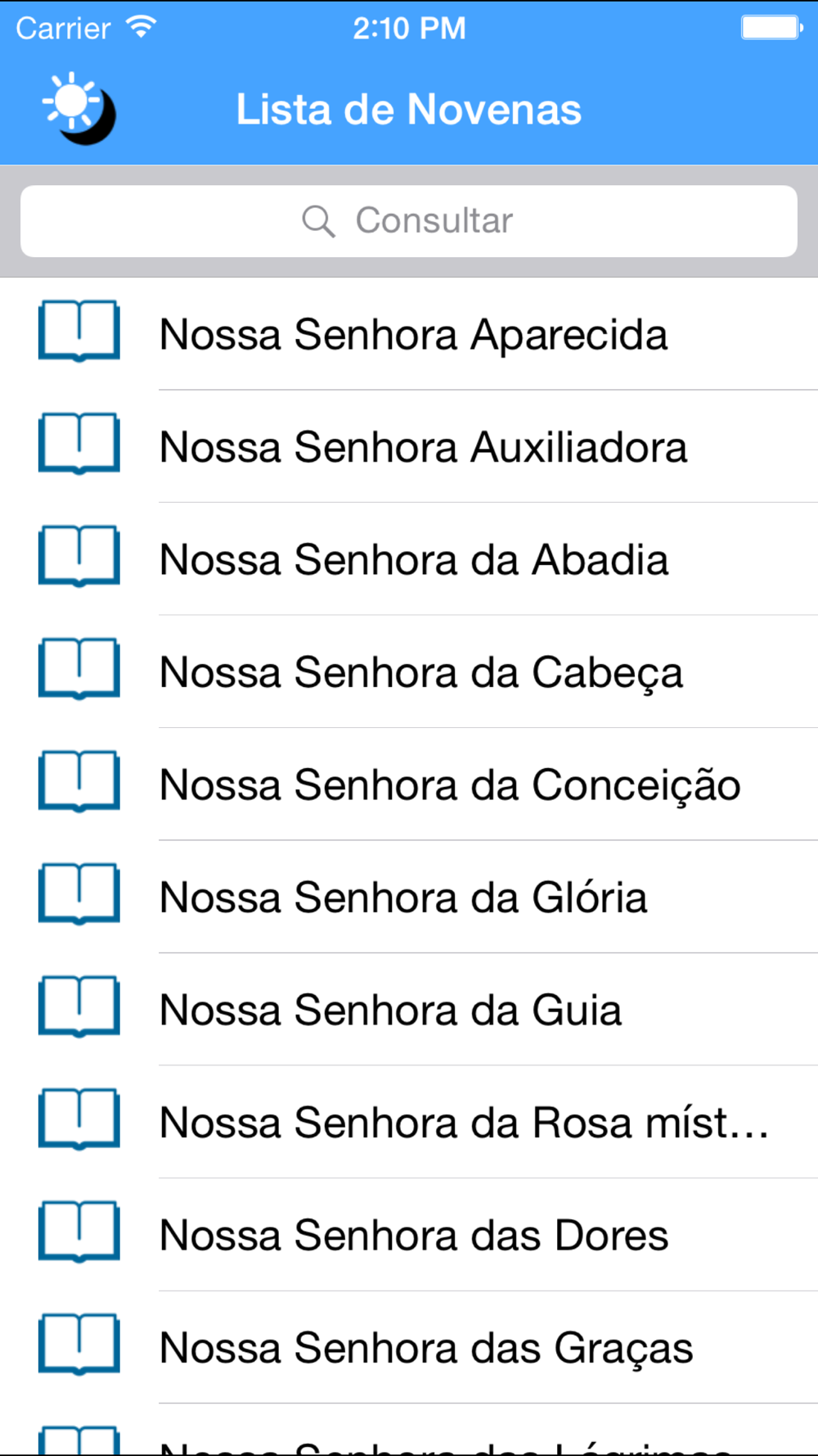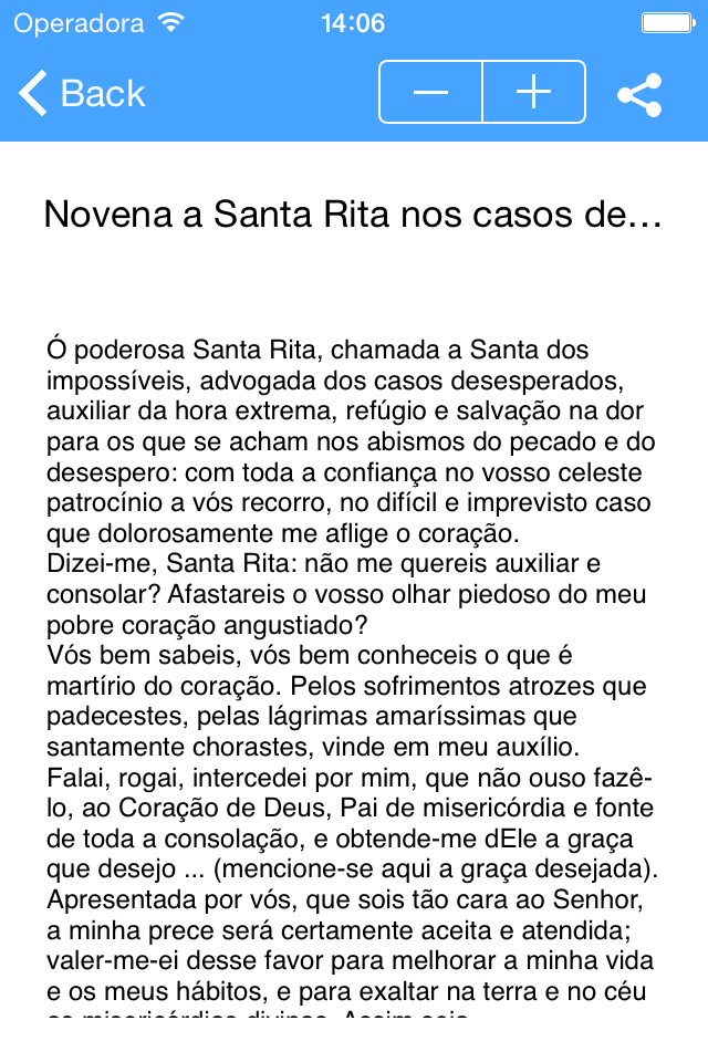 Principais novenas e orações Católica, acompanhamento seu dia dia , com funcionalidade de selecionar novenas favoritas, compartilhar no Facebook, Twitter e outras redes socias, e troca de layout de diurno e notuno.