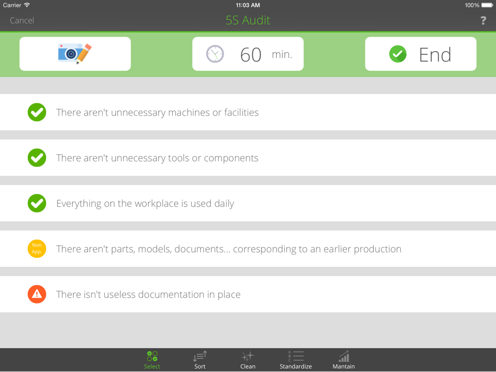 • Perform a 5S audit composed by 5 big families of 5 questions each for a total of 25 questions which will guide you through your research of improvement.