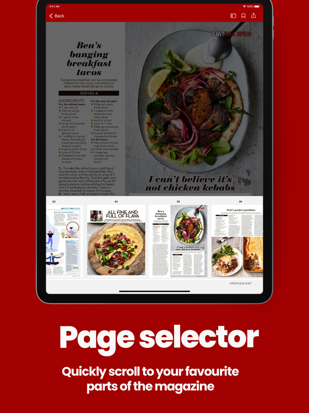 Flip your device and read the magazine as a double page spread or tap the page selector to choose from a thumbnail image of each page