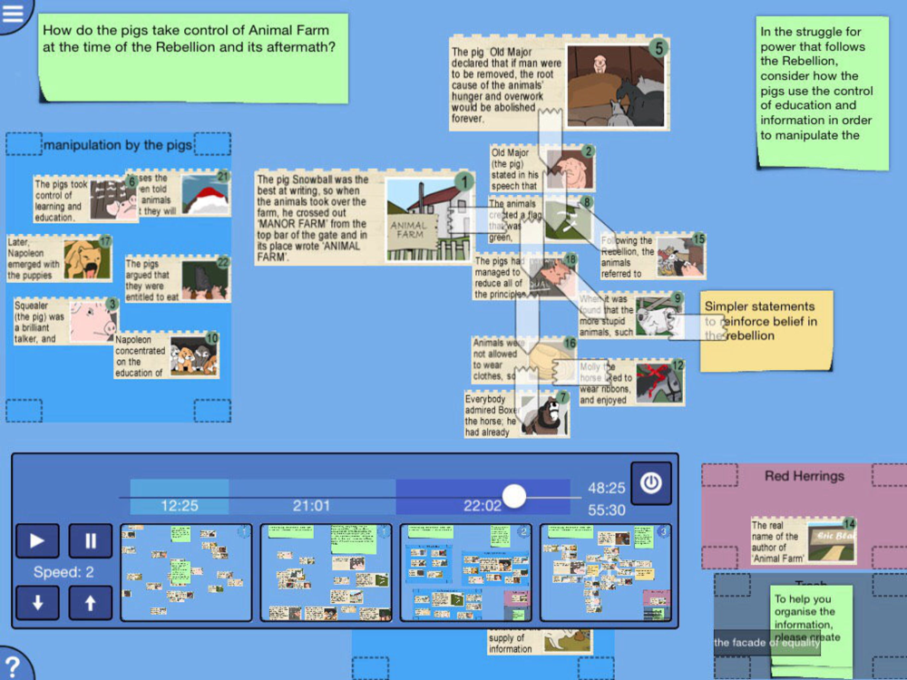 It is intended to help the least able students to identify the various strategies and techniques used by the pigs to seize power in Animal Farm. There is not very much in the way of historical context here; it is mainly designed to focus on the text. However, it could provide a platform for the more able students to develop their understanding of the control of information, and then begin to relate the events in the book to the wider questions of the use and manipulation of the education system and the media by various interested groups.