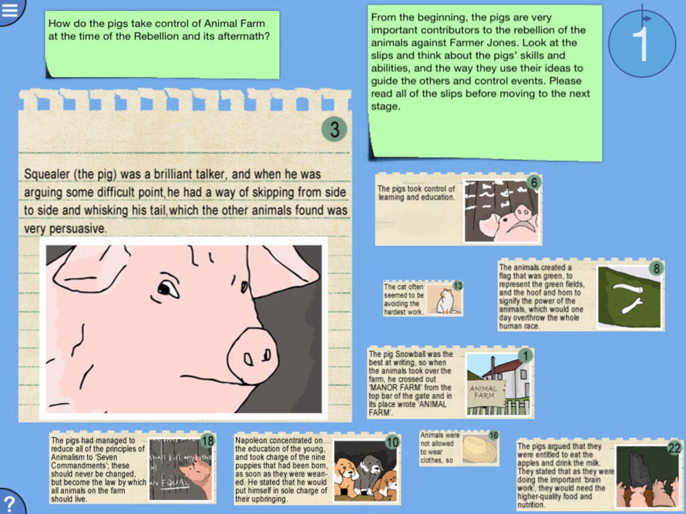 Students are provided with several slips of illustrated information which cover much of the storyline and characters. The students must read and sort through the slips together to come up with an answer to the question “How do the pigs take control of Animal Farm at the time of the Rebellion and its aftermath?”