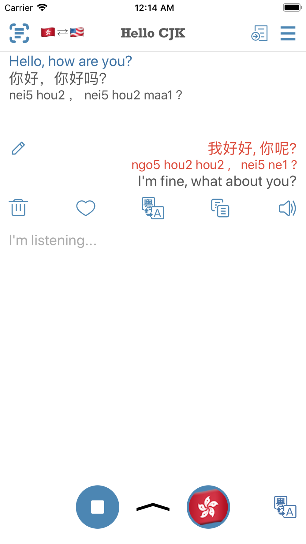 Hello CJK is a simple app that can voice translate English to Chinese[Mandarin, Cantonese], Japanese[Hiragana, Katagana], and Korean[Hangul]. Vice versa, it can also voice translate CJK to English. It can scan printed CJK text into digital format. It can romanize CJK text. It can also read CJK text out loud and can also display the meaning of the Hanzi and Hangul.