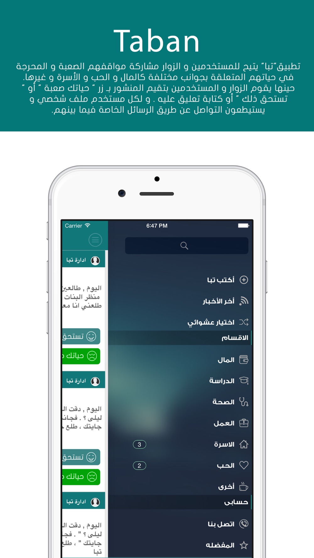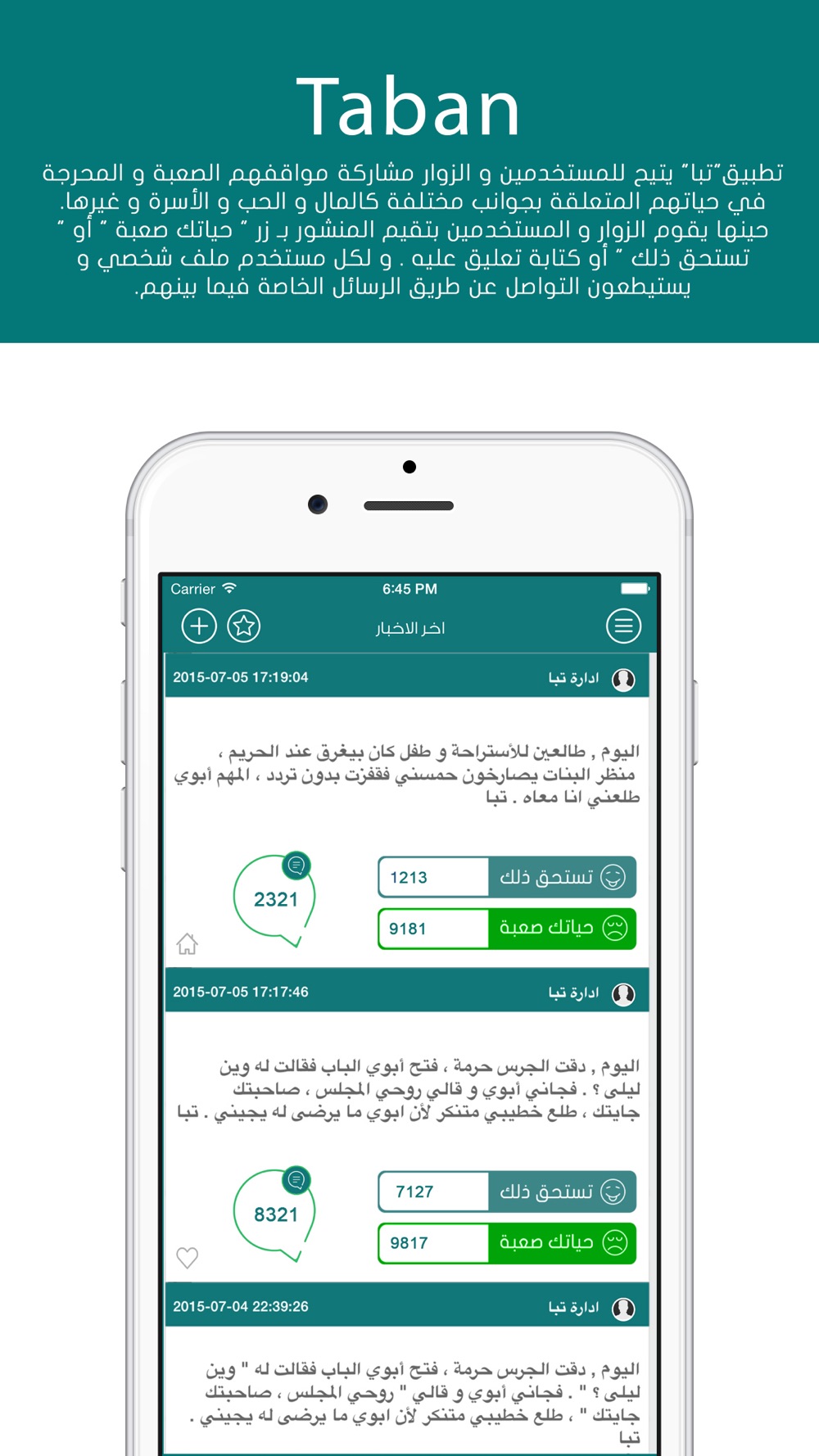 تطبيق"تبا" يتيح للمستخدمين و الزوار مشاركة مواقفهم الصعبة و المحرجة في حياتهم المتعلقة بجوانب مختلفة كالمال و الحب و الأسرة و غيرها. حينها يقوم الزوار و المستخدمين بتقيم المنشور بـ زر " حياتك صعبة " أو " تستحق ذلك " أو كتابة تعليق عليه . و لكل مستخدم ملف شخصي و يستيطعون التواصل عن طريق الرسائل الخاصة فيما بينهم.