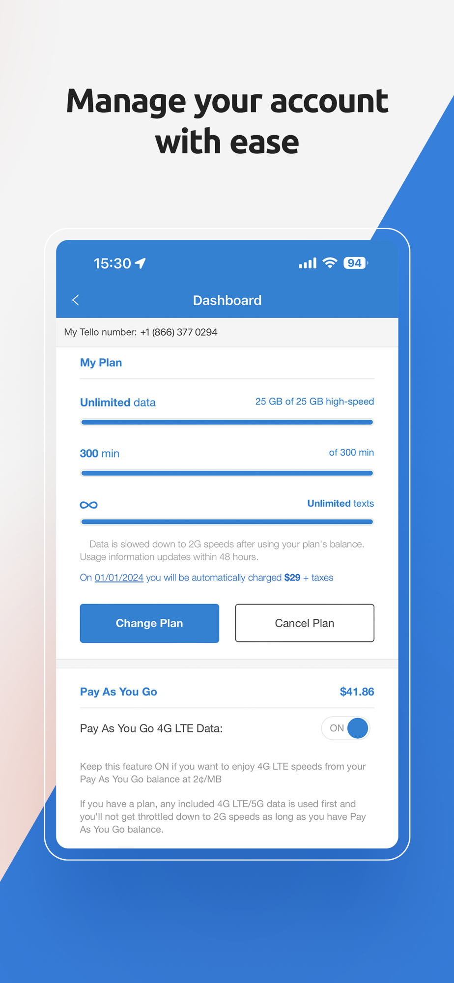 Say hello with the “My Tello” app! You can have your account details at your fingertips, see your remaining balance, check rates for any destination or find answers to your questions.