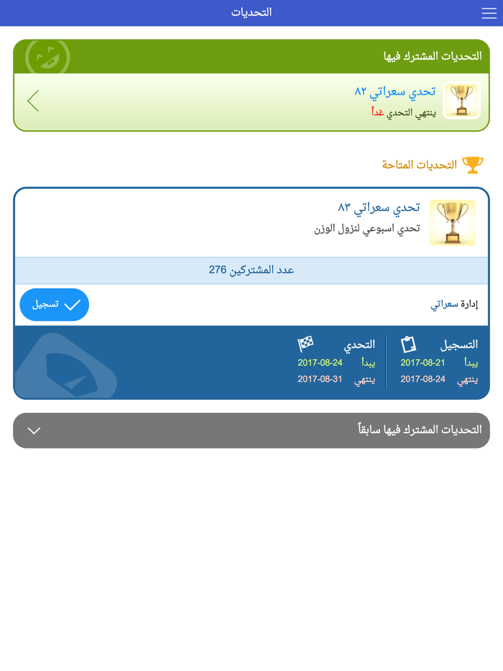 7- تحديات نزول الوزن من خلال المشاركة في تحدي بعضها أسبوعي وبعضها شهري وعرض انجازات المتحدين وترتيبهم فيه بناءً على نسبة النزول