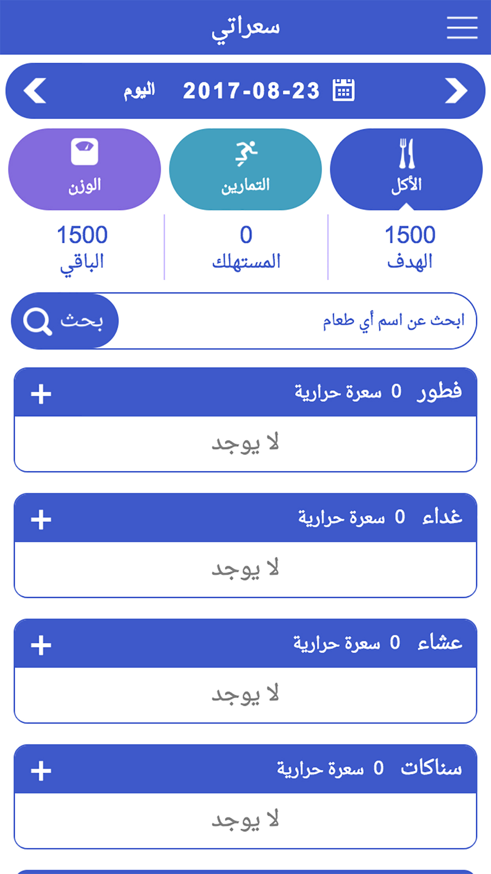 2- يوميات الأكل للإضافة والمتابعة اليومية حسب نوع الأكل (فطور, غداء, عشاء, سناكات)