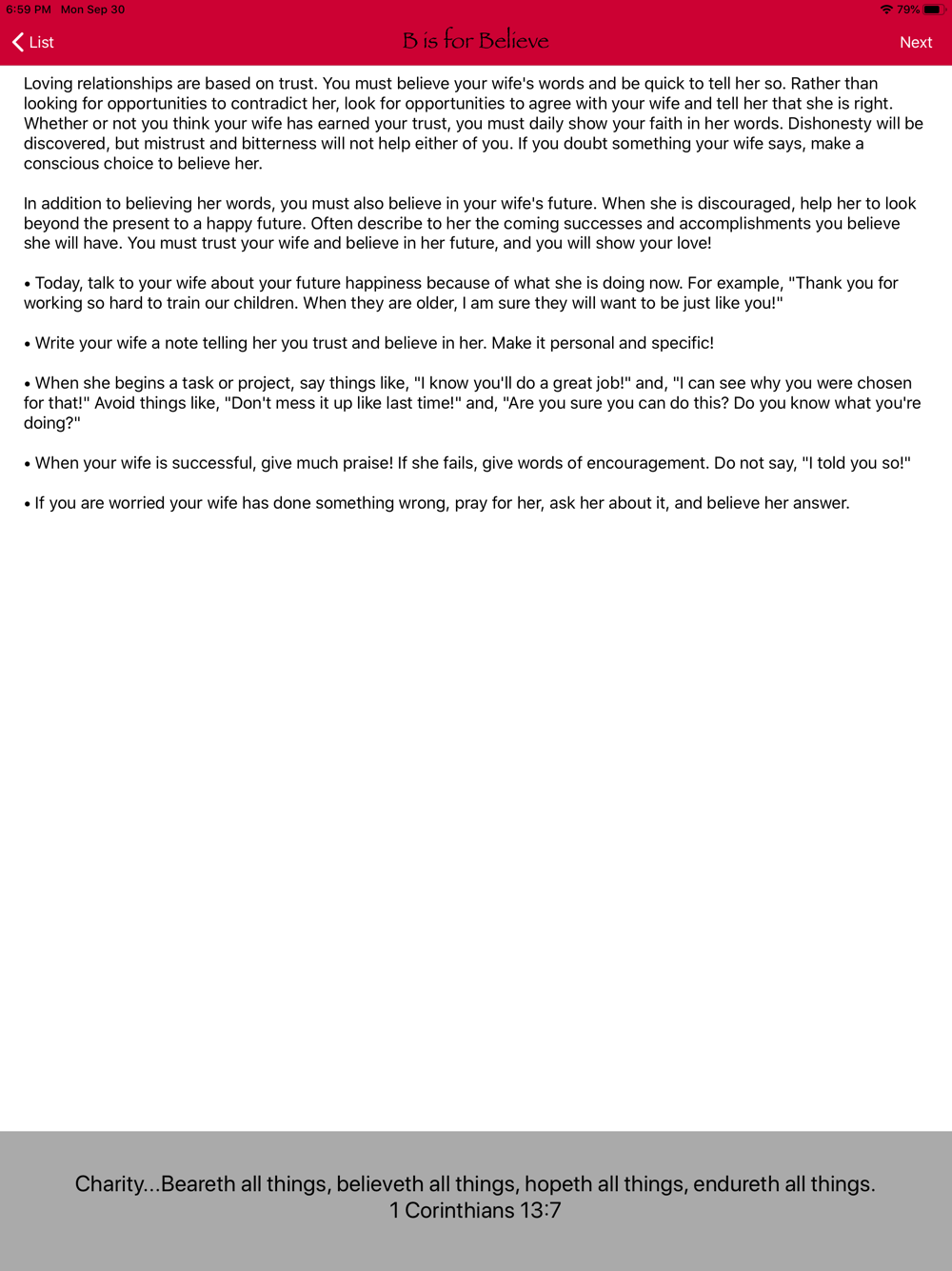 For both men and women, this app provides Biblical principles from A to Z, plus well over 100 practical tips to help a husband or wife improve any marriage!