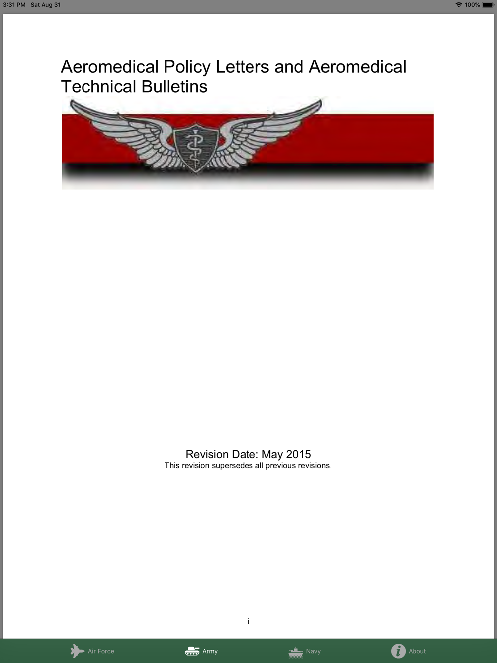 This application presents the medical standards for special duty personnel of the United States Air Force, Army, and Navy as well as other useful tools and information for Aerospace Medicine professionals.