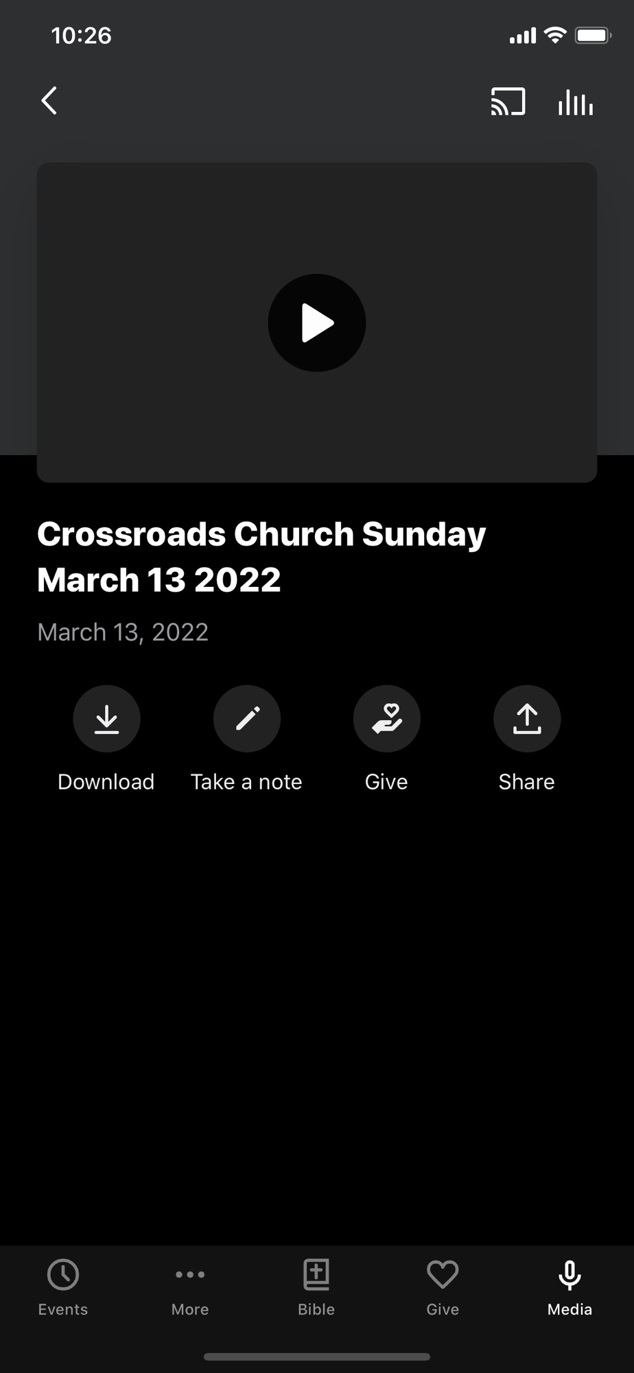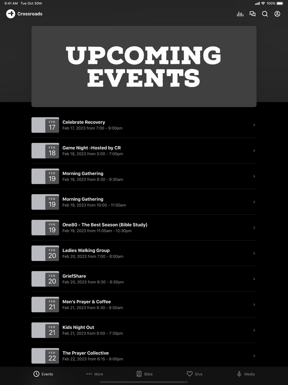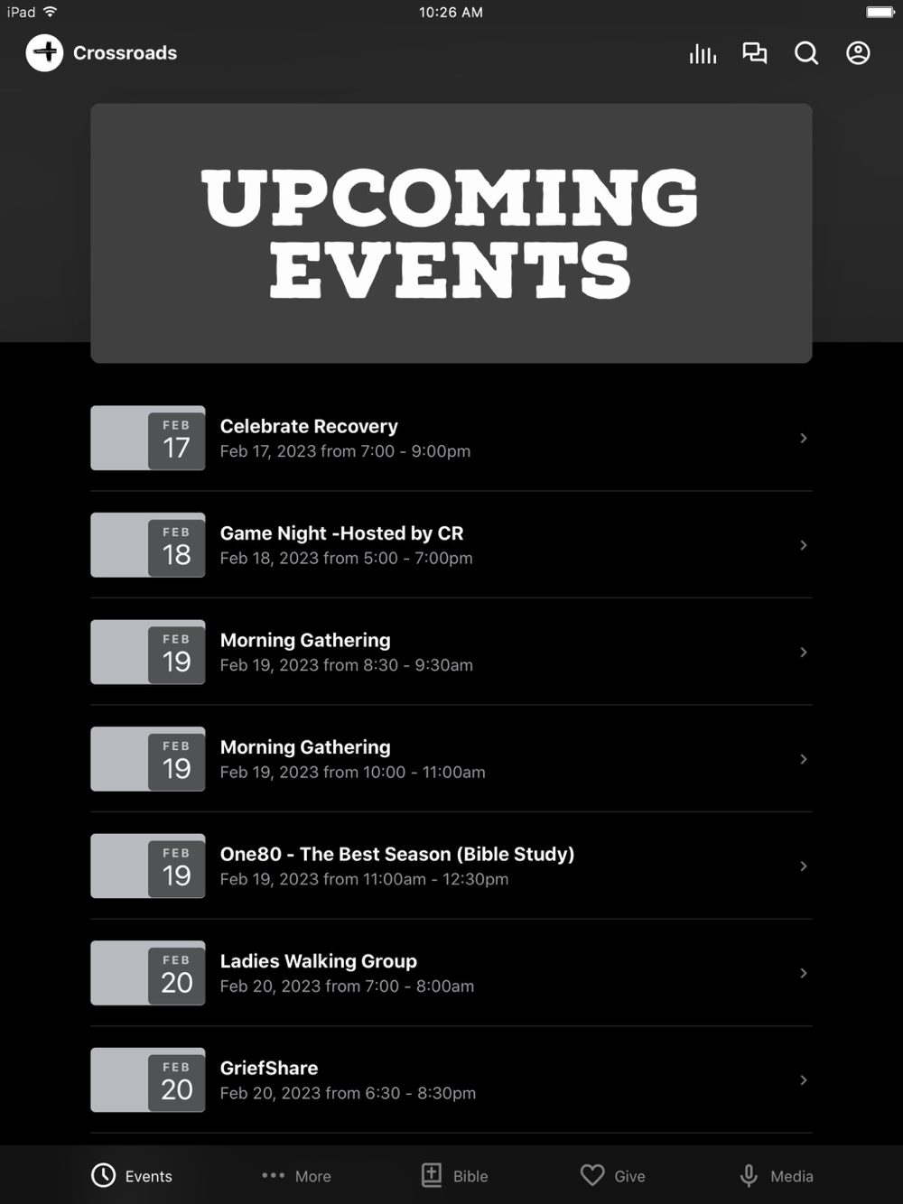 The Crossroads Church App provides instant access to upcoming Events, Blog posts, a map to our campus location, a link for Online Giving, and an online Bible with reading plan. Come connect with us!