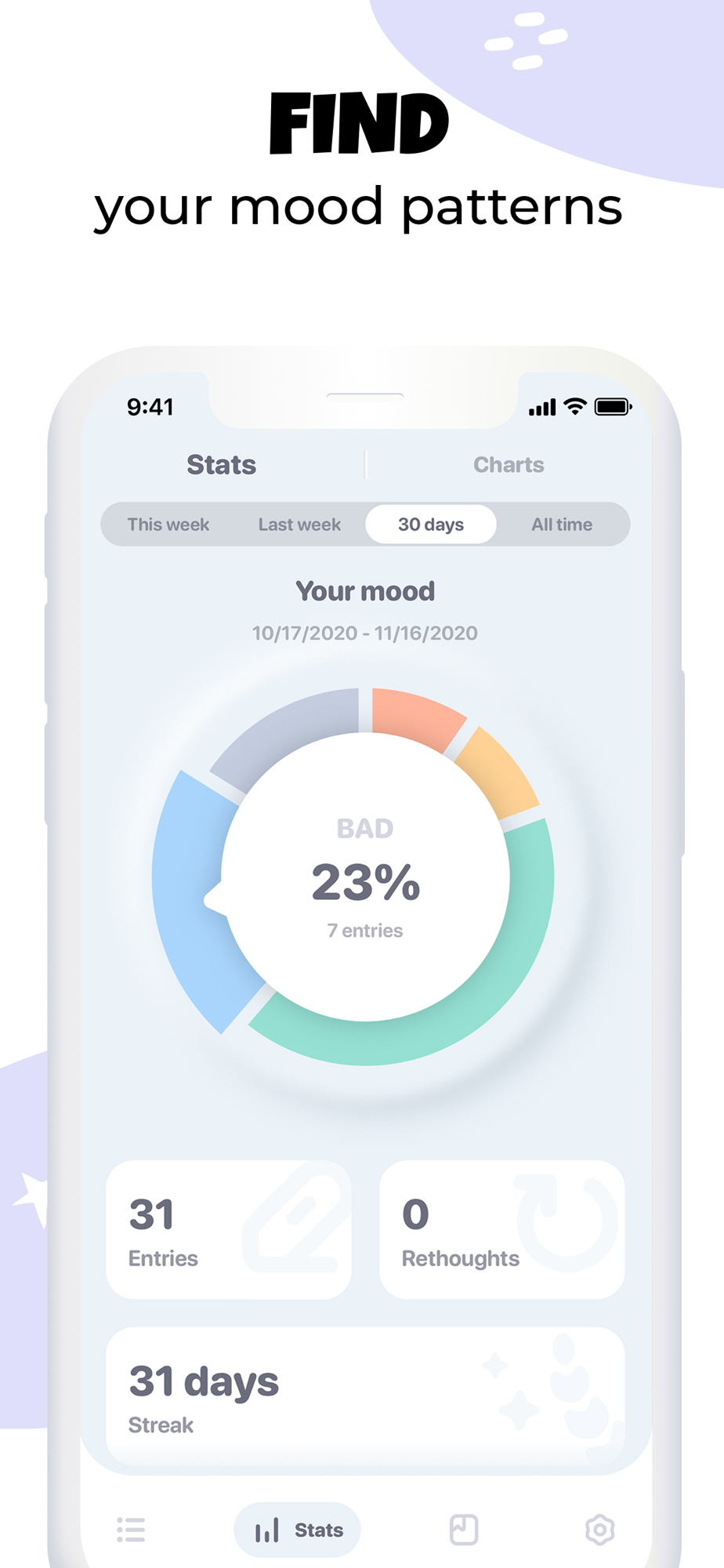 - Monitor your personal statistics and check your mood insights