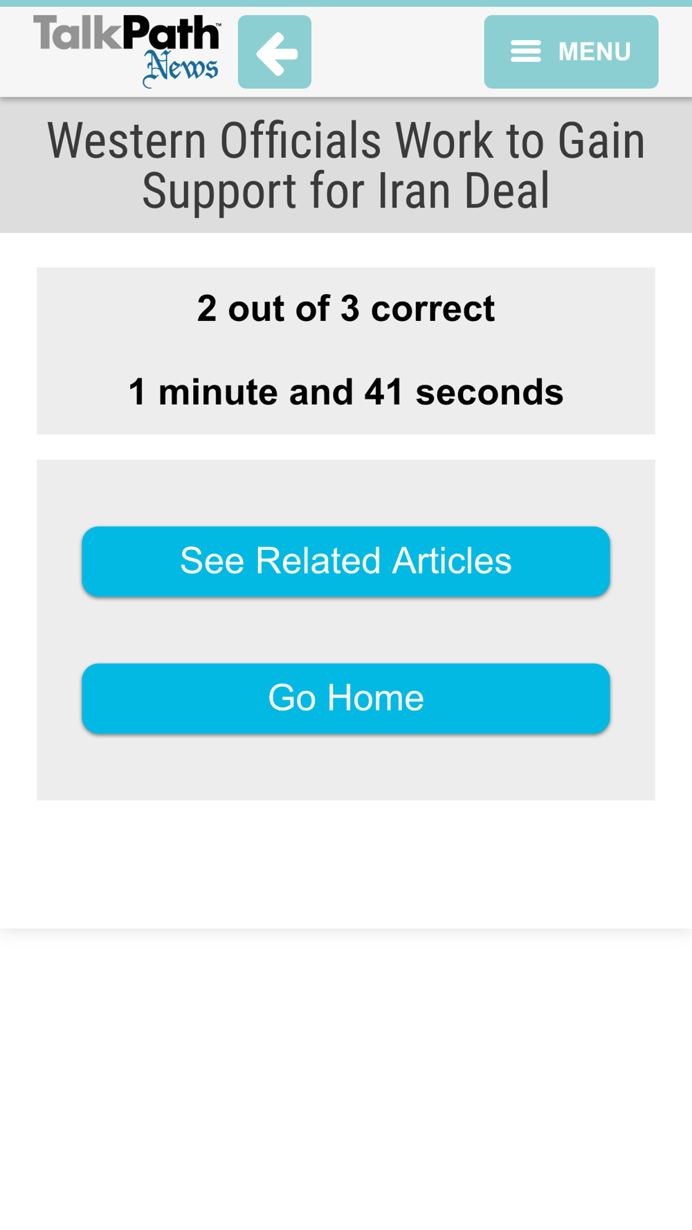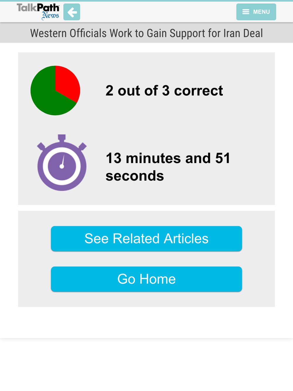 With TalkPath News, articles are read aloud and highlighted to help those with speech or language disorders follow along. At the end of every article a series of questions test reading comprehension, with results on the questions providing immediate feedback.