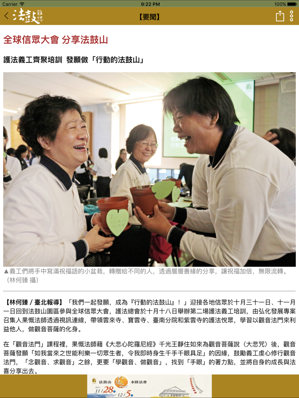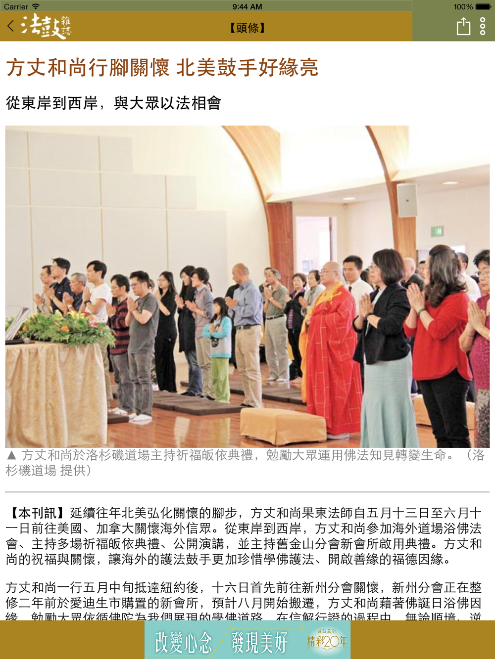 刊頭「來法鼓山觀音道場,參北臺灣第一聖地」一偈,由聖嚴法師親自題字,邀請社會大眾親臨新北市金山區「法鼓山世界佛教教育園區」,體驗心靈環保、人間淨土的禪悅境教。