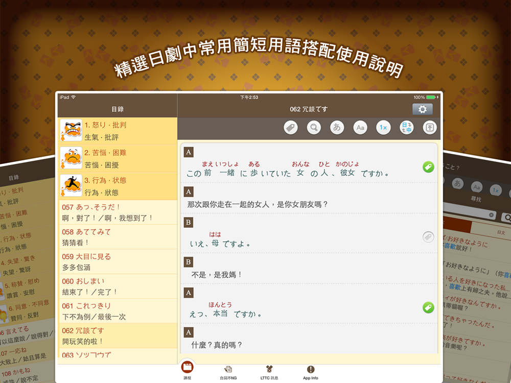 * 「課程」精選日劇中常出現的簡短用語,歸納為六大情境,再細分成不同單元。