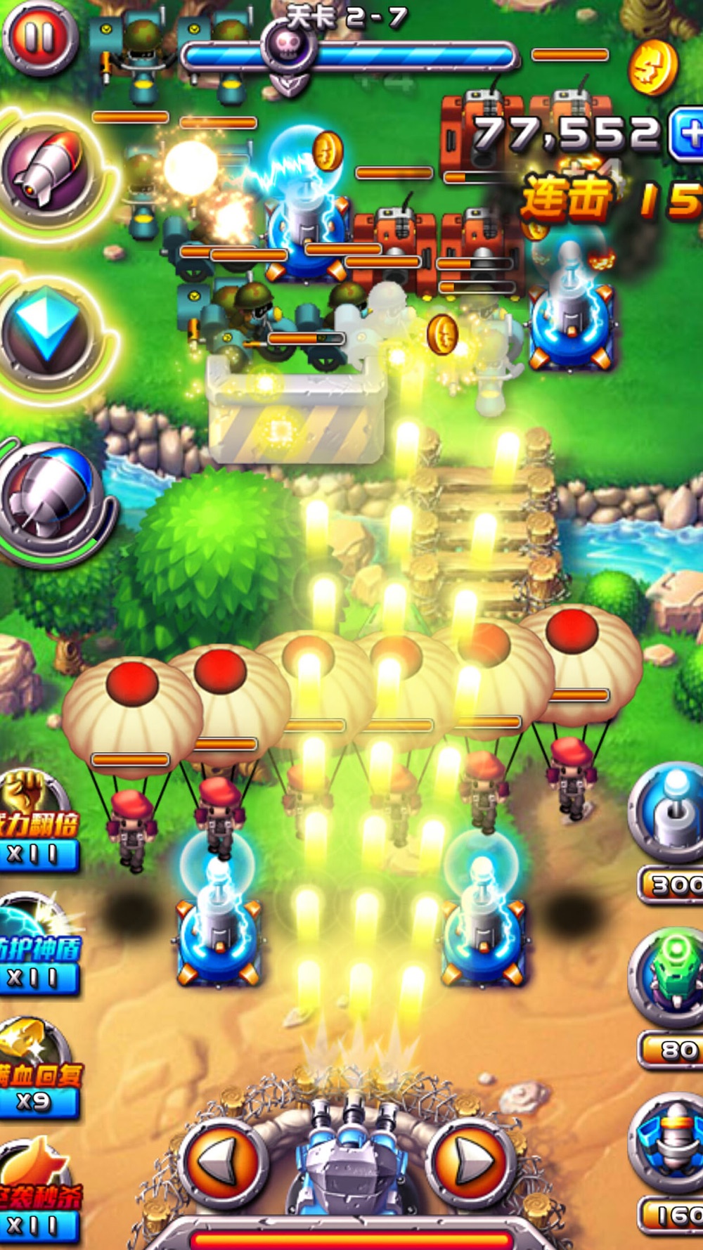 《火线奇兵》既包含了经典塔防游戏的策略性,又包含了飞行射击游戏的操作性。游戏采用触屏操作模式,支持多点同时操作,加强了游戏趣味性。二战战争风格,不同的地图拥有不同的地形场景,画面精美,颜色明亮,战争场面激烈,爆炸效果绚烂;节奏感极强的音乐和各种带感的声音效果;以及全新的防御塔、敌人、技能、地图、以及游戏模式,超爽的武器装备,不同的敌军组合,全新的游戏背景,都给您带来身临其境的极致感受!