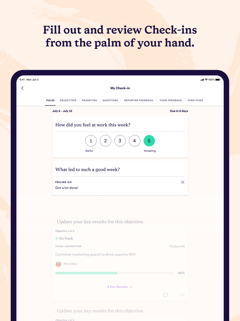 This brief, automated weekly process leads to meaningful conversations about everything from how to improve an employee’s role, to the creation of brilliant product innovations. With our new iOS app, have the most important conversations with your team or manager from anywhere!