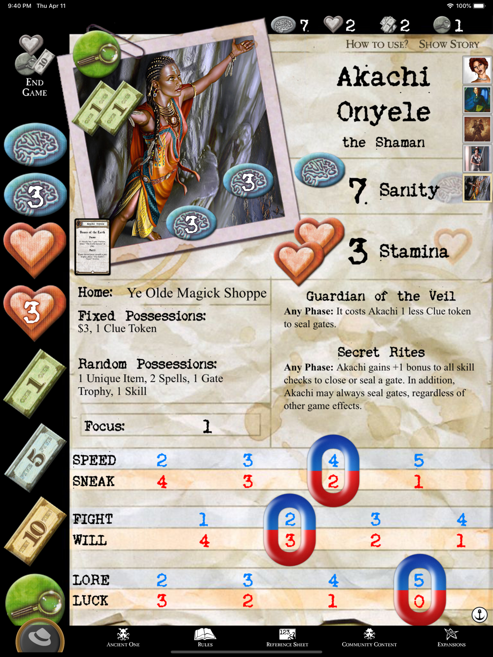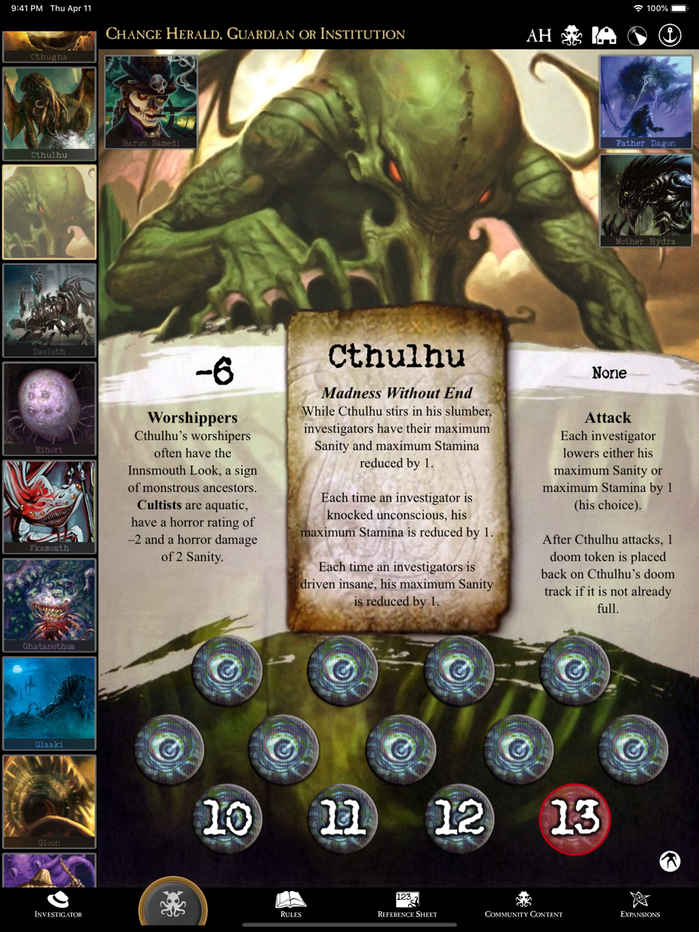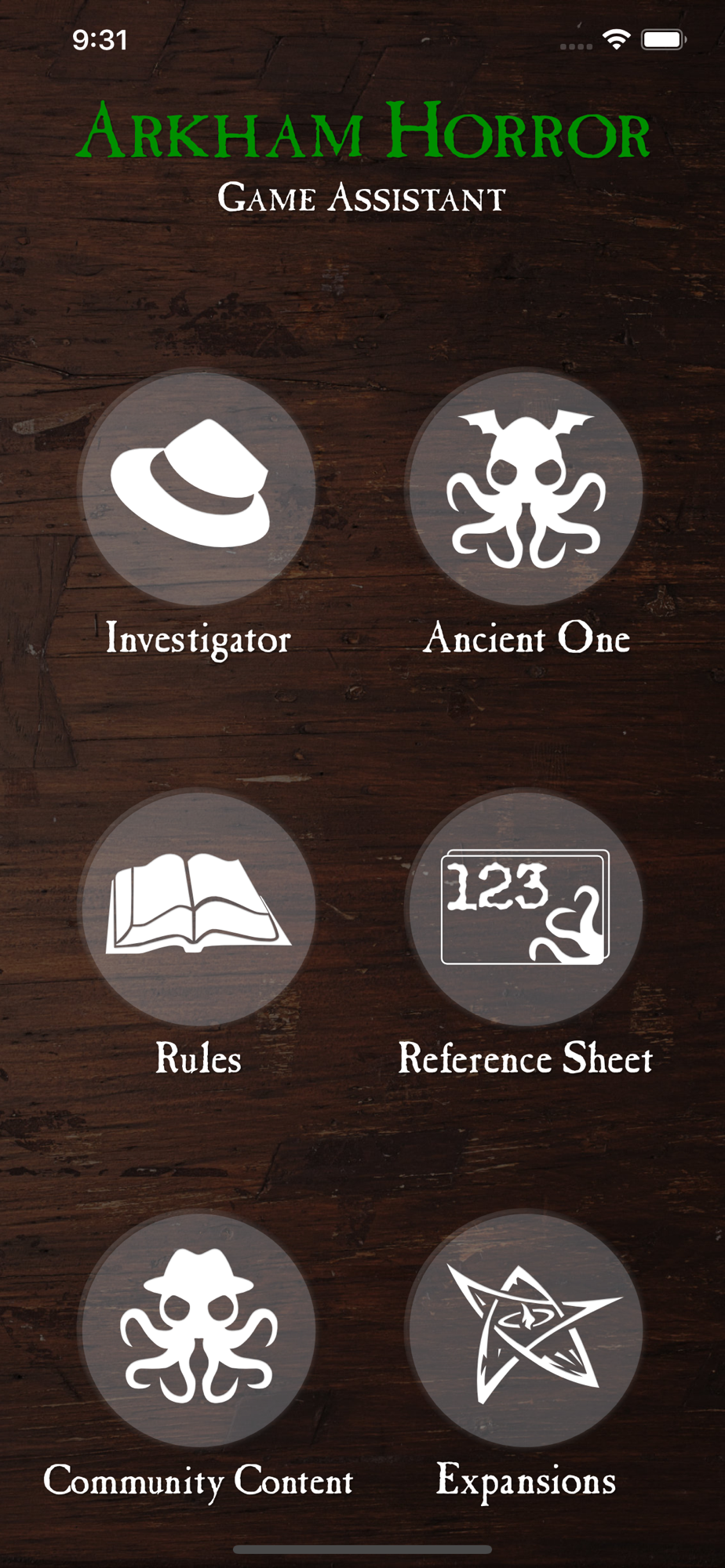 It contains all the Investigators and Ancient Ones sheets from base edition of Arkham Horror (other expansions are available through in-app purchases). It also contains simple game rules. Cards are interactive and can be used with the game itself as a substitute for classic tokens and sheets.