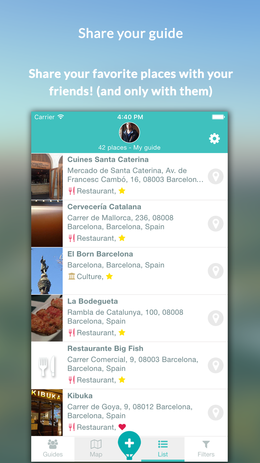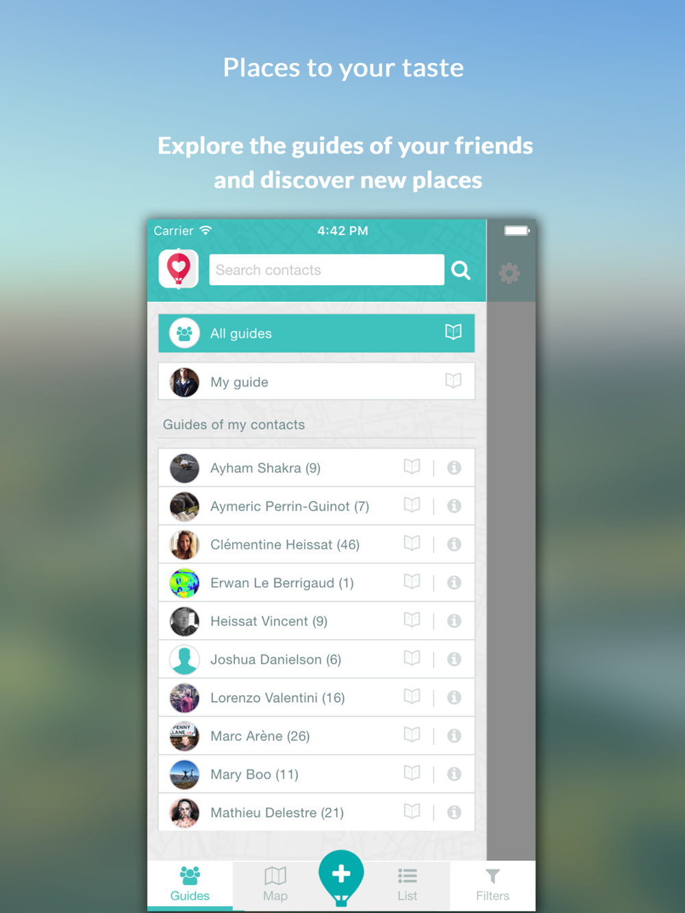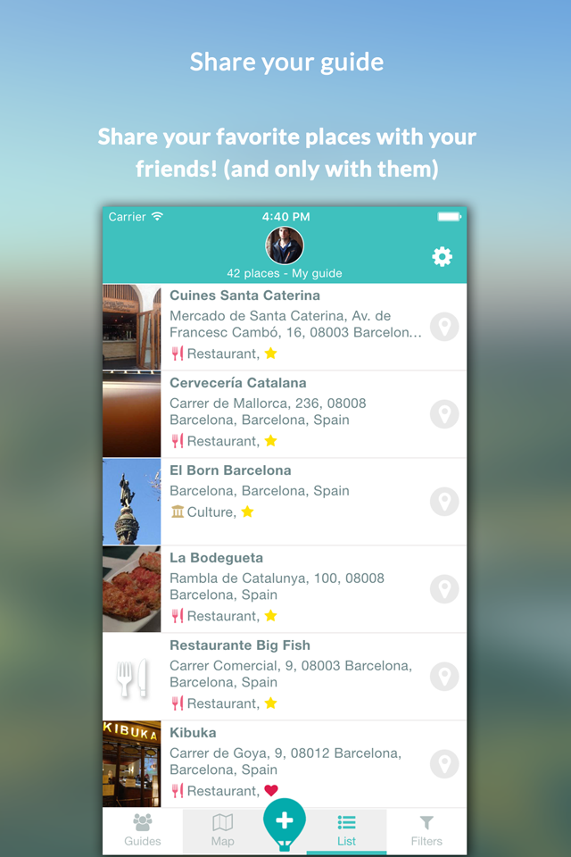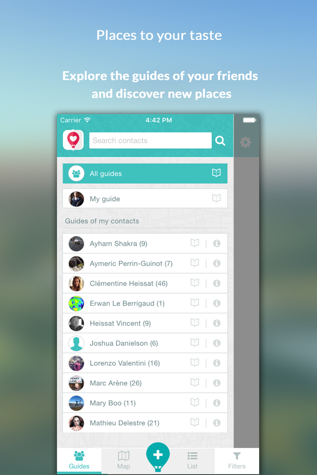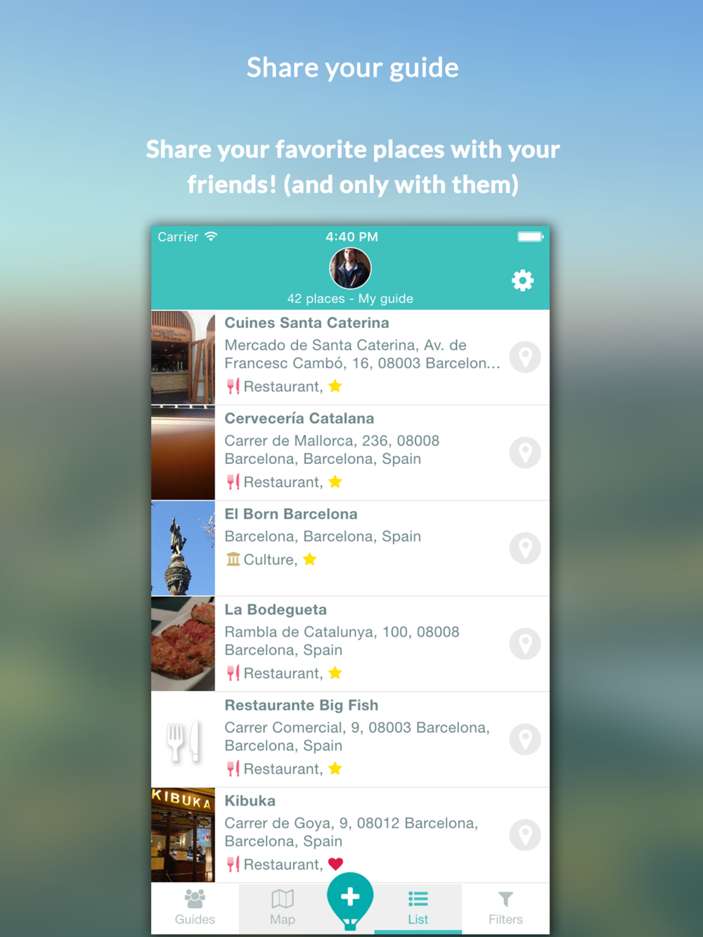You can share your guide with your friends and let them discover your favorite places in your favorite cities. You can also discover new places in their guides.