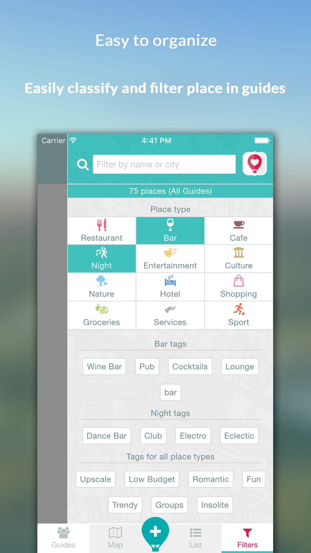 Places in your guide are organized by type (restaurant, bar, culture…) and review.