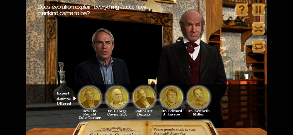 Charles Darwin, the naturalist, geologist, and leading contributor to the fundamental principles of Evolution, comes alive through synthetic interview technology. Duquesne University biology professor John Pollock collaborated with Carnegie Mellon University's Entertainment Technology Center (creator of the Synthetic Interview technology) to develop an interactive experience in which users to select from a list of questions to ask the virtual Darwin, portrayed by Pittsburgh actor and Carnegie Mellon drama alumnus Randy Kovitz. Questions cover Darwin's adventures, the principles of evolution, the public response to his discovery, his childhood, personal quirks and a number of other topics. More than a dozen modern-day biologists, religious authorities, an ACLU lawyer and other experts provide modern commentary and answer questions beyond Darwin's 19th century knowledge.