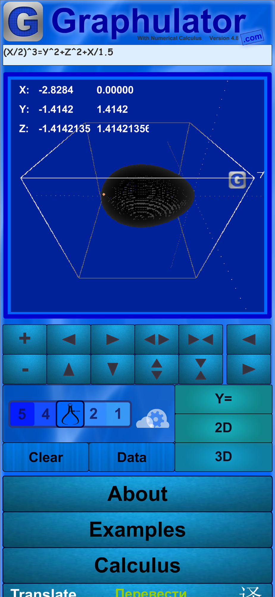 Graphulator is a numerical graphing calculator for 2 or 3 variable equations. Plot both functions and non-functions. Includes data output! Now includes numerical calculus.