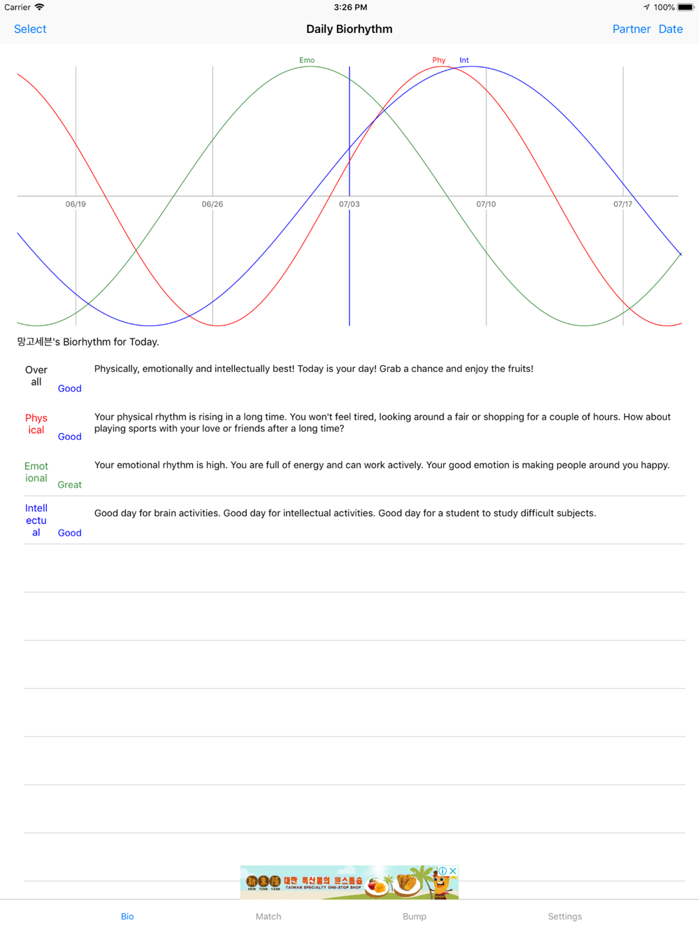 You can get your daily biorhythm at a specific time. If you register a person who you like as a partner, his or her biorhythm and the best day for a gift or a proposal, etc. will be offered. Enjoy your life by checking you and your partner’s biorhythm everyday.