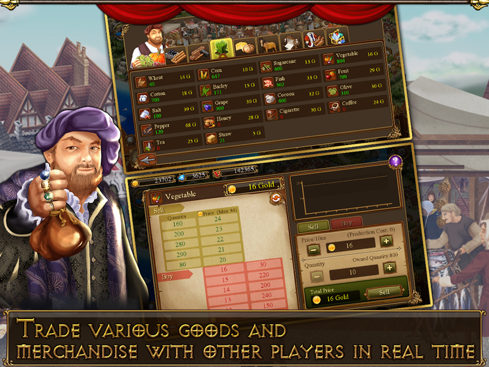 Create profit by trading more than 70 different types of goods and merchandise with the players in the same nation.