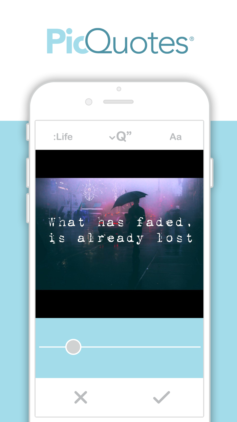 Then add your favourite image from your library or take a pic with your camera. PicQuotes features all the the best photo editing options including, fonts, colors, and tones to turn your favourite quote into an inspirational masterpiece!