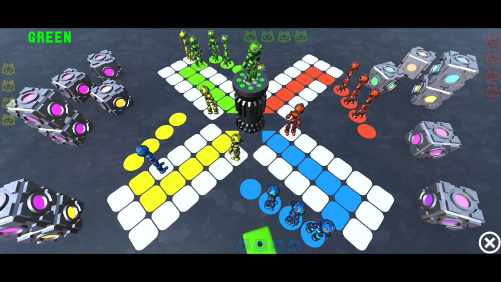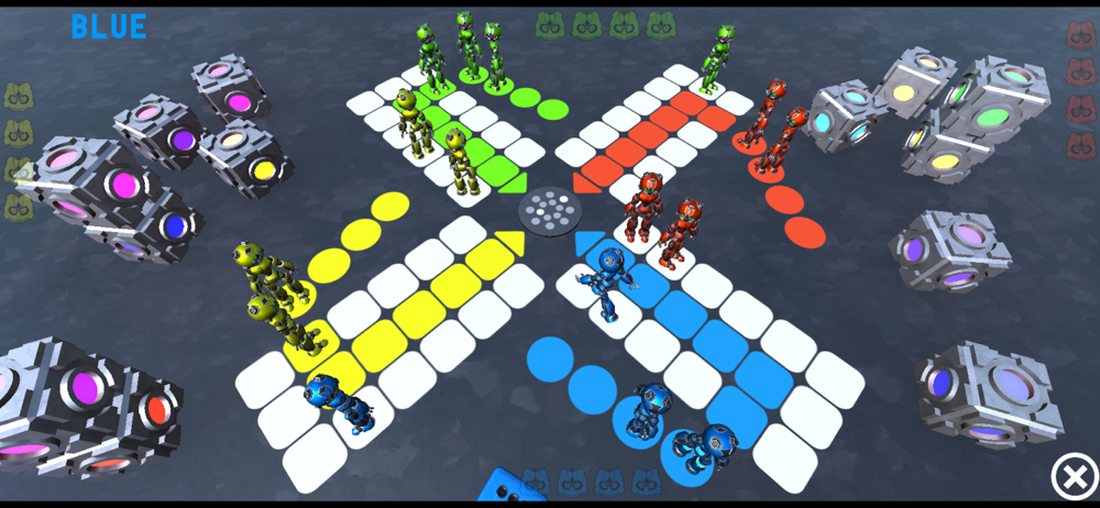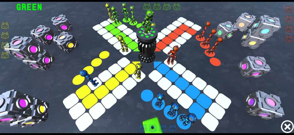 This is a new twist on the classic game of Ludo involving robots. You can play against friends or the computer, with up to 4 players on the board. Each player will take turns to roll the dice. If the dice lands on a 6, then you can move a robot onto the board and roll the dice again. If you roll a 6 a third time in a row the next player will take their turn. If your robot lands on a robot of another player at the end of the move, then they will go off the board. The aim of the game is to get all of your robots around the board and onto the last square, where they will be taken out of the game. The first player to do this will win.
