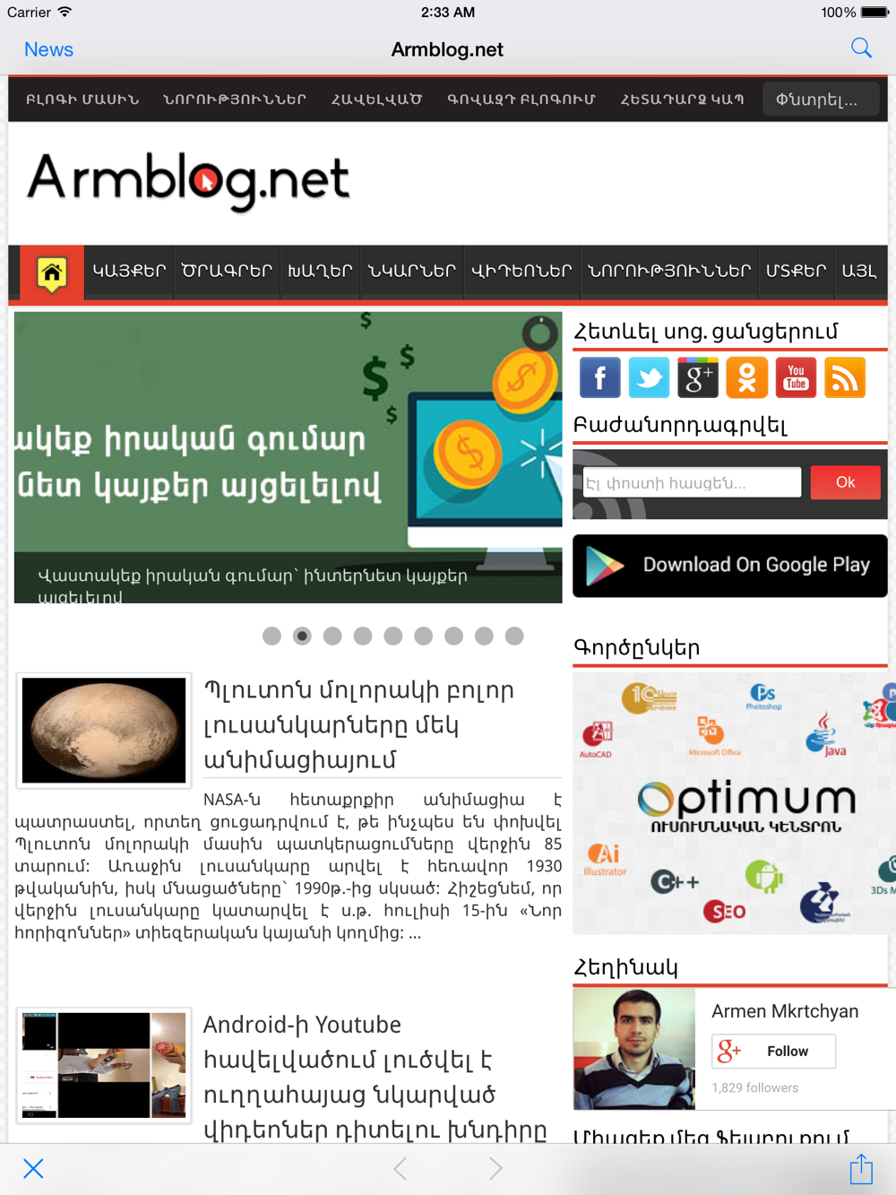 The Armblog.net website was created in 2010 and in a very short period of time it became one of the most visited websites in Armenia. The blog is mostly about IT sphere. There are also other topics placed here (games, videos, pictures). As new topics are placed nearly every day, one can always find new and interesting information here. The visitors can also participate in the creation of new topics by suggesting news, pictures, information about new inventions and other information connected to the IT sphere.