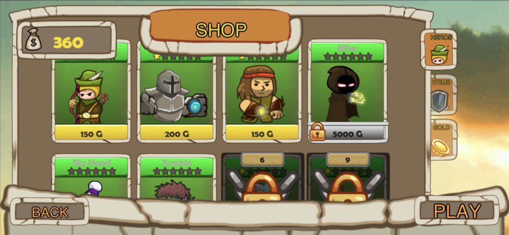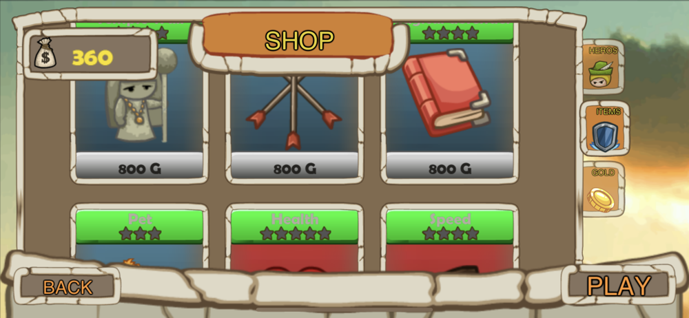 Visit the shop in order to upgrade heroes and unlocked new heroes,temple....