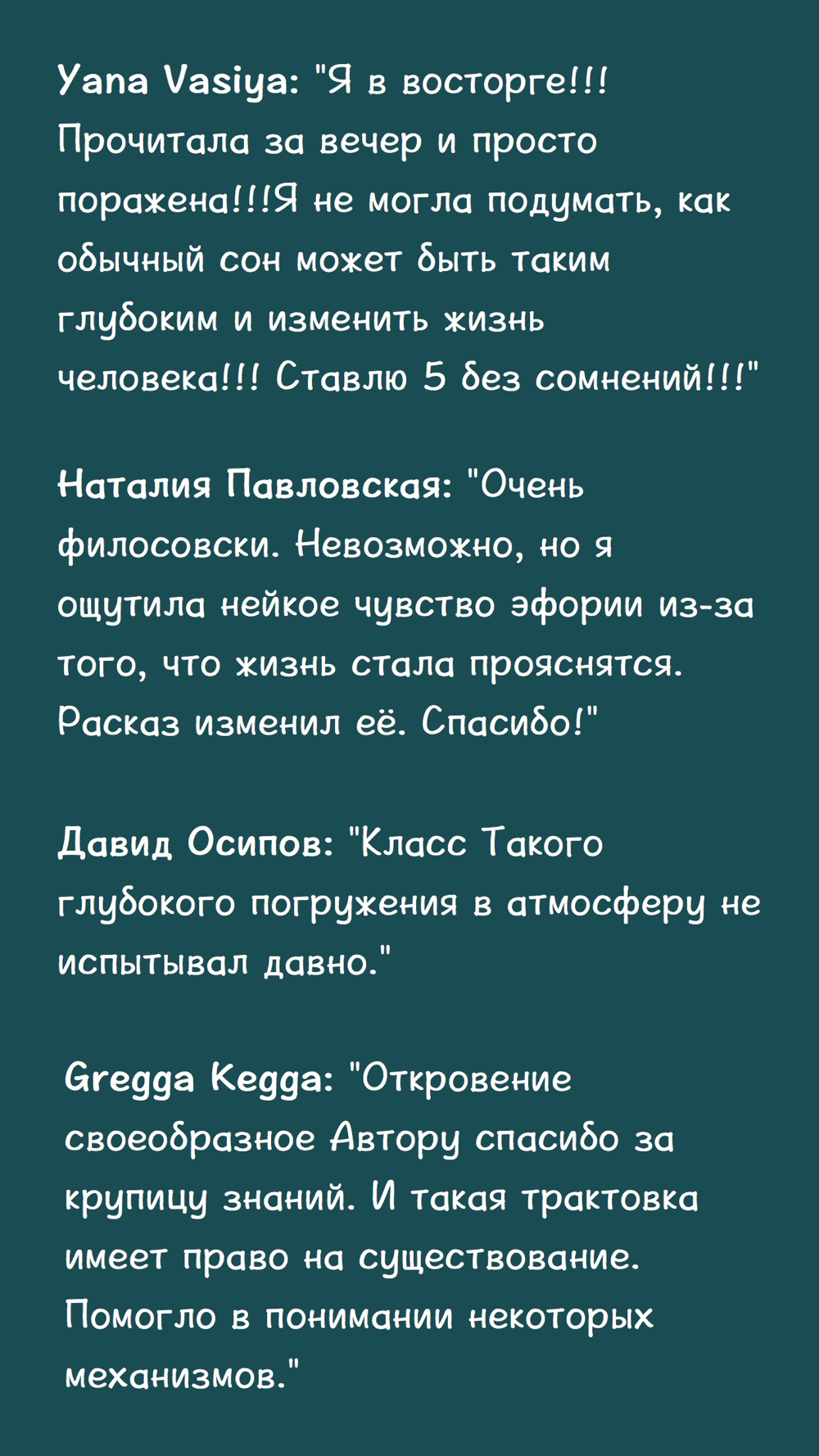 Yana Vasiya: "Я в восторге!!! Прочитала за вечер и просто поражена!!!Я не могла подумать, как обычный сон может быть таким глубоким и изменить жизнь человека!!! Ставлю 5 без сомнений!!!"