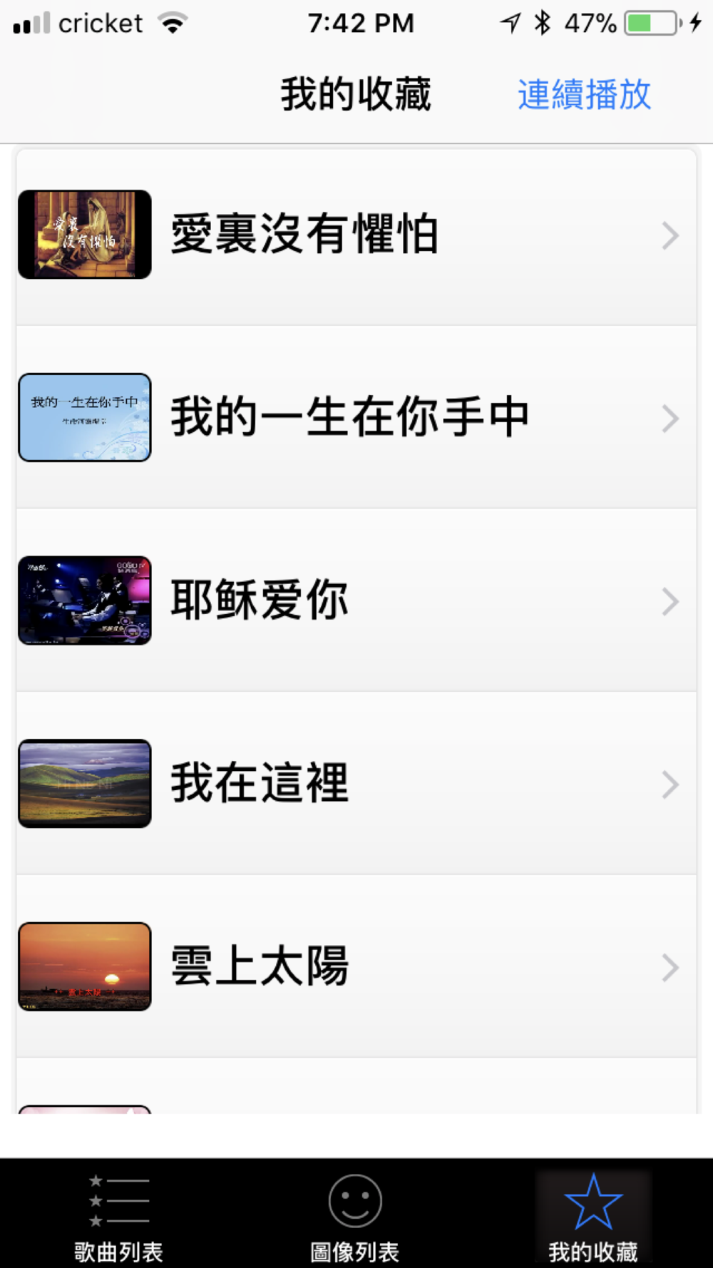 感謝您的留步。本app精選了五十首膾炙人口的基督徒歌曲, 并提供連續播放功能。 無論是在中國,還是在世界上任何一個角落,你都可以隨時隨地收聽和觀看這些基督徒歌曲和視頻。連續播放功能既可以讓歌聲一直陪伴您進入夢鄉,也可以通過藍牙在汽車音響上連續收聽,為您的旅途生活帶來樂趣和享受。