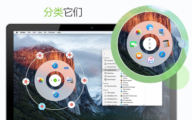 您的应用程序是有组织的,并且有一个愉快的圆形视图与菜单半径。使用Mac变得更加快速和高效!