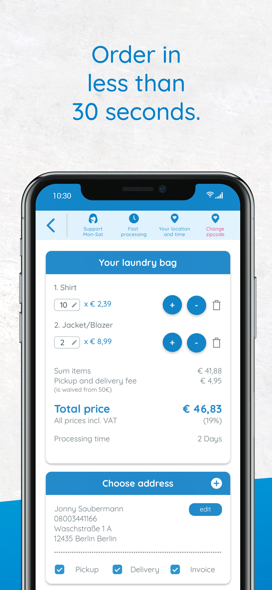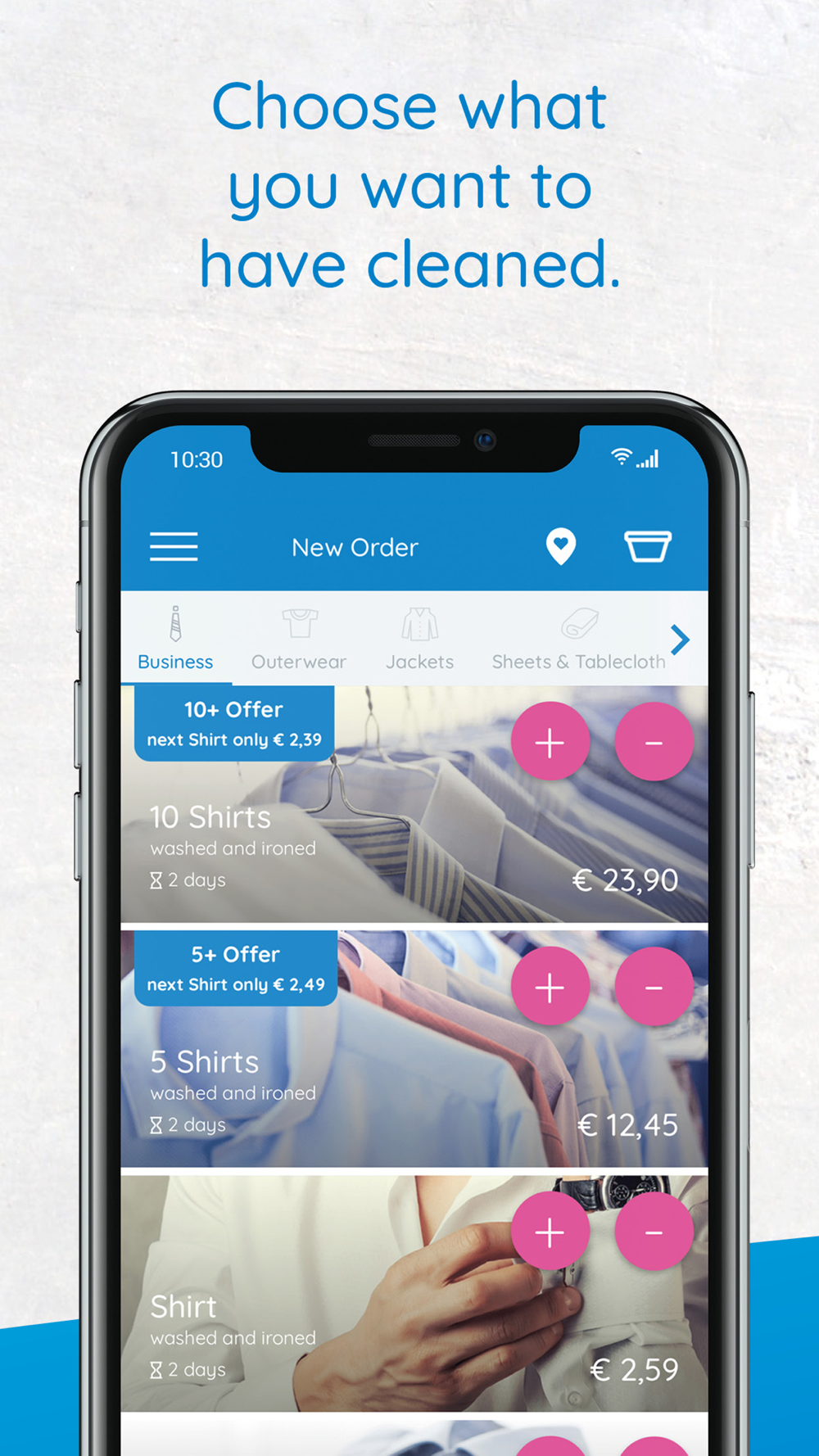 Order your textile cleaning service conveniently via app now at the address of your choice. Have your things picked up for cleaning and delivered, whether at home or in the office. The standard processing time is 48 hours on weekdays.