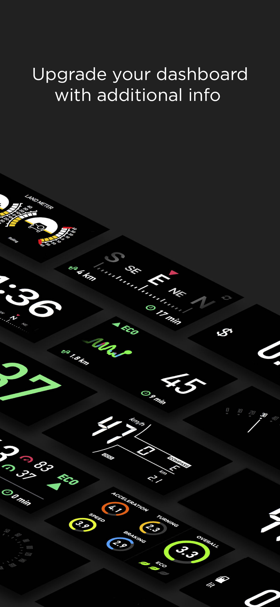 HUD Widgets app is a set of handy and popular navigation widgets, like speedometers, trip info, landmeter, weather, eco-driving, etc... All widgets work in regular or head-up display (HUD) mode.