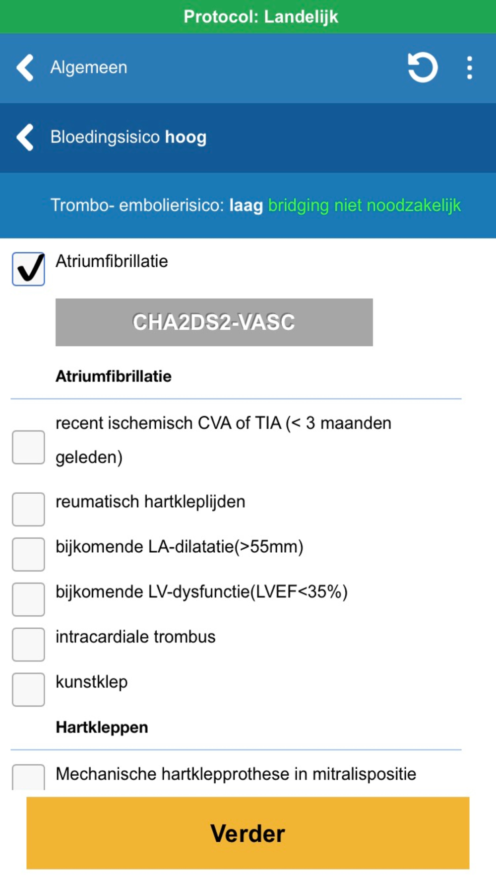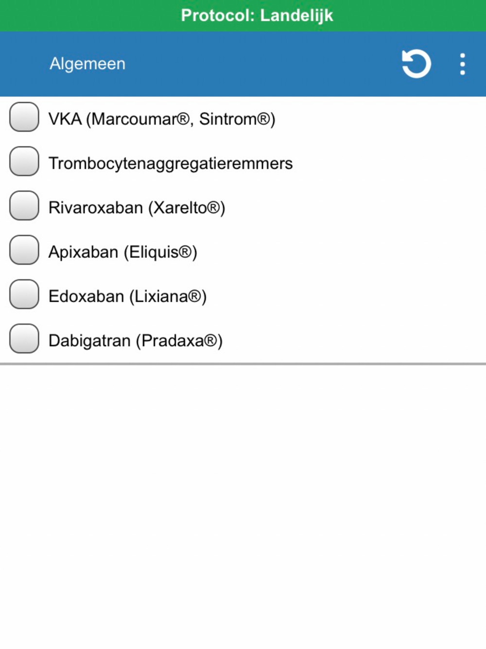 Deze app kan u ondersteunen bij het kiezen van het juiste bridgingprotocol ten aanzien van het antistollingsbeleid bij patiënten die vitamine K antagonisten, DOAC's of trombocytenaggregatieremmers gebruiken en een operatieve ingreep of invasief onderzoek moeten ondergaan.