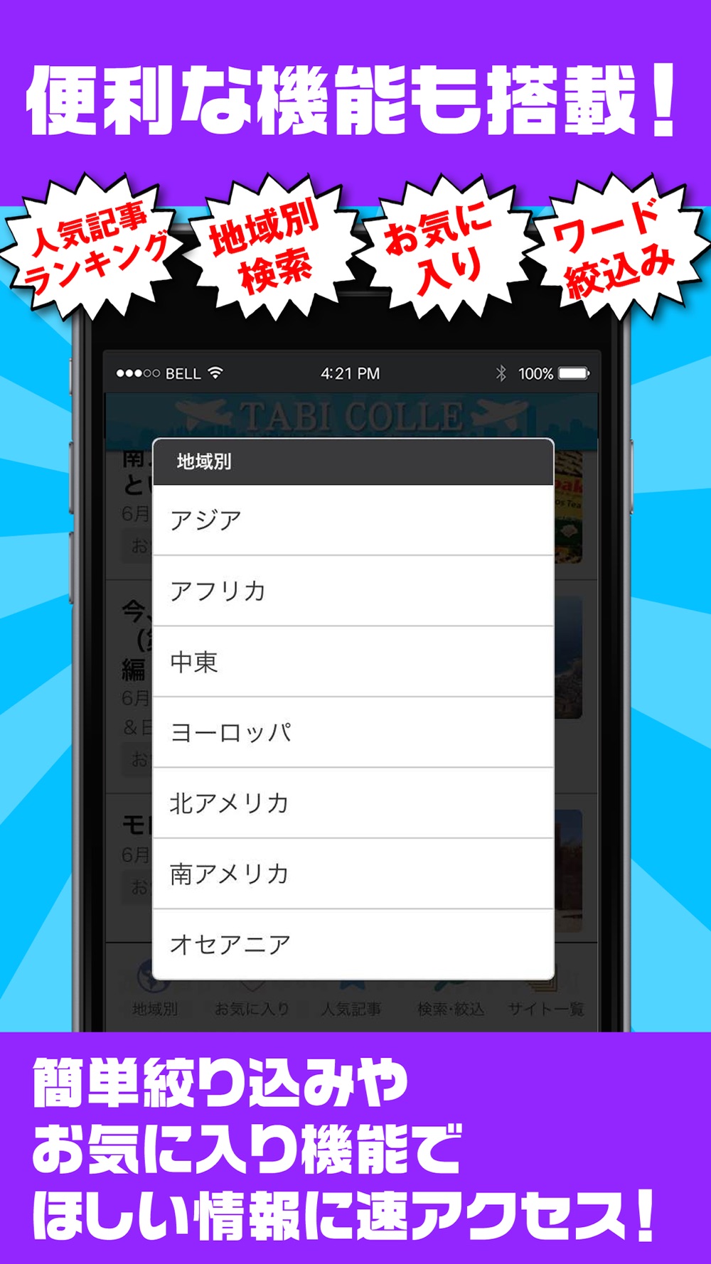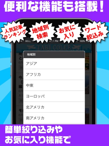 アジアを選ぶとアジアの情報が、ヨーロッパを選ぶとヨーロッパ旅行の情報が抽出されますので、興味のある地域を選んでスマホ旅行をお楽しみください!