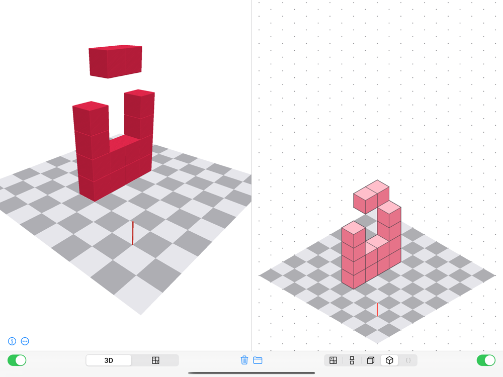 You can add or remove cubes by touching them or creating them with the code view. Look at your buildings and rotate the three dimensional view.