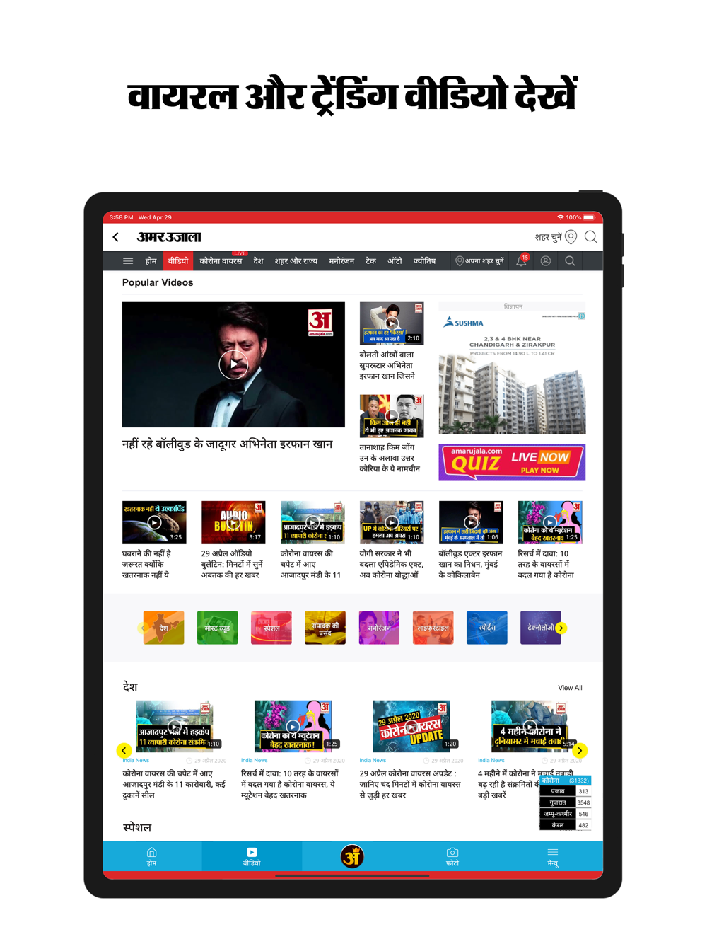 “Hindi News iOS App by Amar Ujala” is an iOS based news application of the leading Hindi newspaper Amar Ujala. Hindi news App of Amar Ujala offers latest and breaking news in Hindi. The app is regularly updated to ensure that its readers gets latest and updated news in Hindi, breaking news and updates in national, international and local news. Install Amarujala.com Hindi news app for National, International and city level news of all small and big cities of Uttar Pradesh, Uttarakhand, Himachal Pradesh, Delhi NCR, Punjab and Jammu. Also read special coverage on Entertainment, Bollywood, Sports, Cricket, Business, Politics and various trending categories around the web.