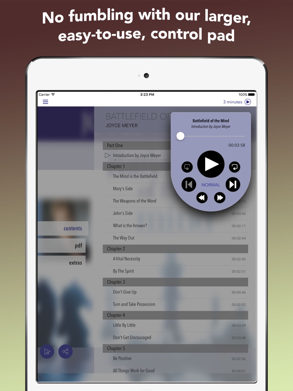 • PLAYER CONTROLS. Includes listen (play), pause, multi-speed fast forward/reverse, jump ahead/back, chapter skip, one-touch chapter- and bookmark browser. There is also a “scrub” bar that finds any point inside the chapter with just a tap.
