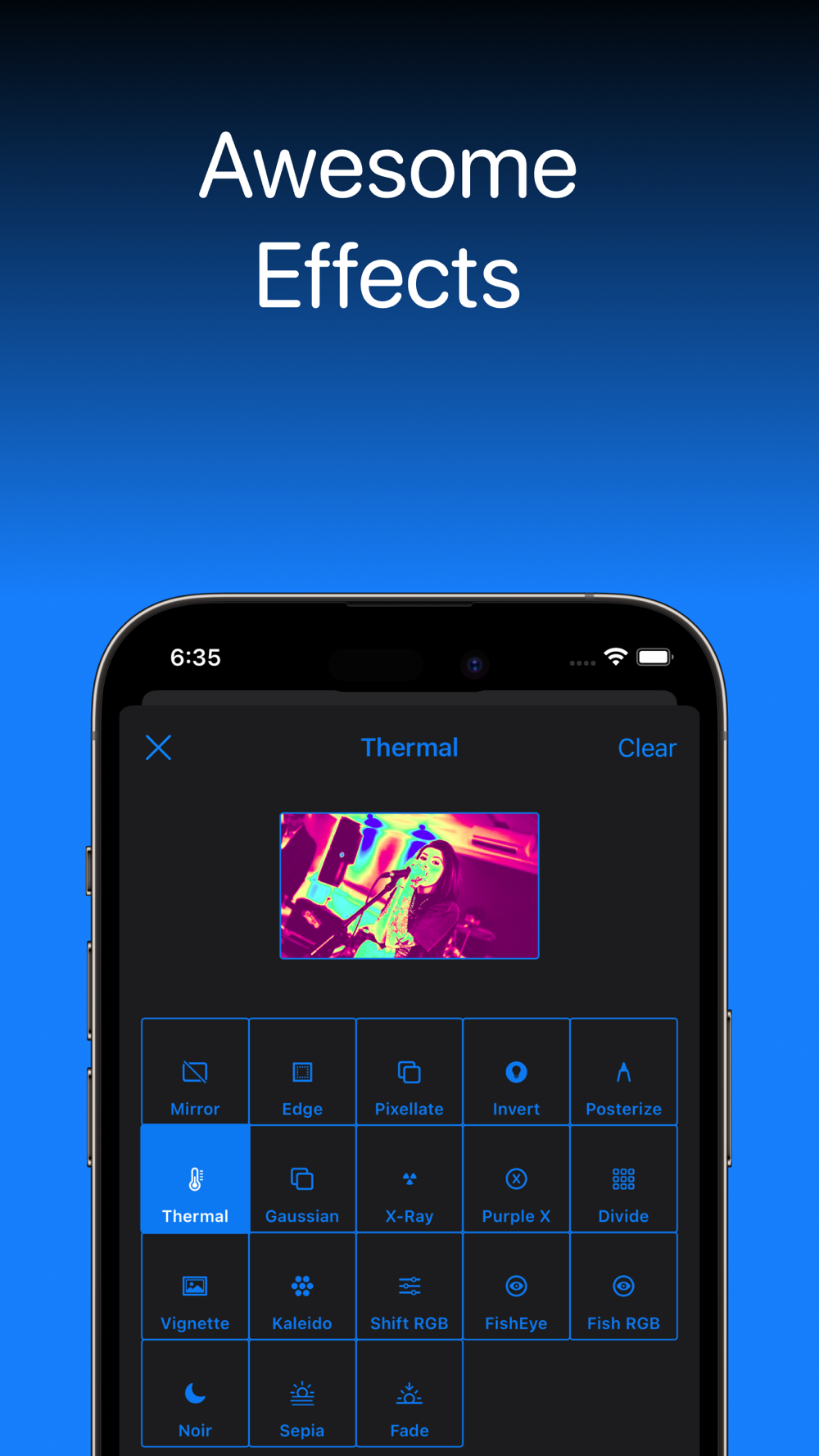 - Effect filters, including: Blur, Divide, Edge Detect, Fish Eye, Fish Eye RGB, Heat, Invert, Kaleidoscope, Mirror, Monochrome, Pixellate, RGB levels, Shift RGB, Toon Shading, Tracing, and Vignette