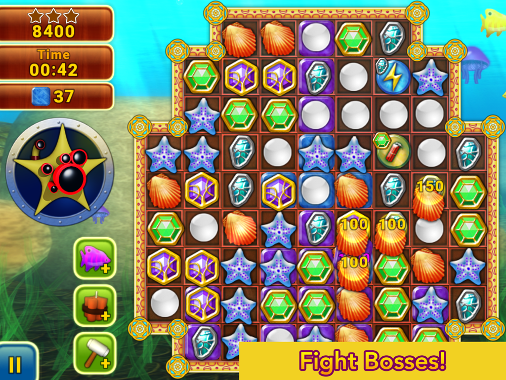 Step onboard the big submarine and wander the deep ocean. Dive and collect treasures to destroy matching lines of three or more objects. Acquire power-ups like Bomb and Lightning to improve your score. As a bonus, there's a brave captain to help you navigate the game. Explore the depths of the ocean in OceanuX, an underwater match-3 game.