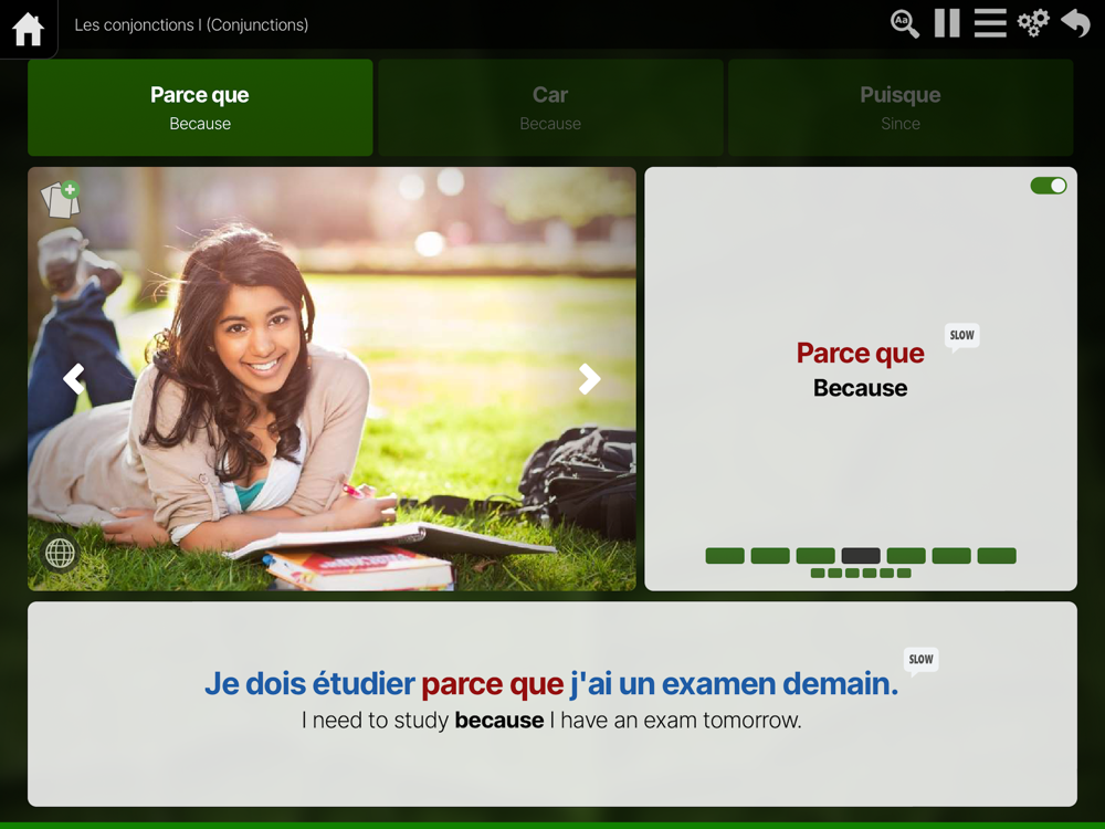 Ouino French is the all-in-one complete solution to learn French fast. The program now includes over 450 lessons, 60 shorts stories, several pronunciation exercises and over 1300 engaging games and challenges. It is the most customizable French learning program. Each lesson has useful and easy to use options that allow you to take control over your learning. Options include setting the amount of time between examples and controlling the pronunciation playback speed. Become proficient and confident in French.