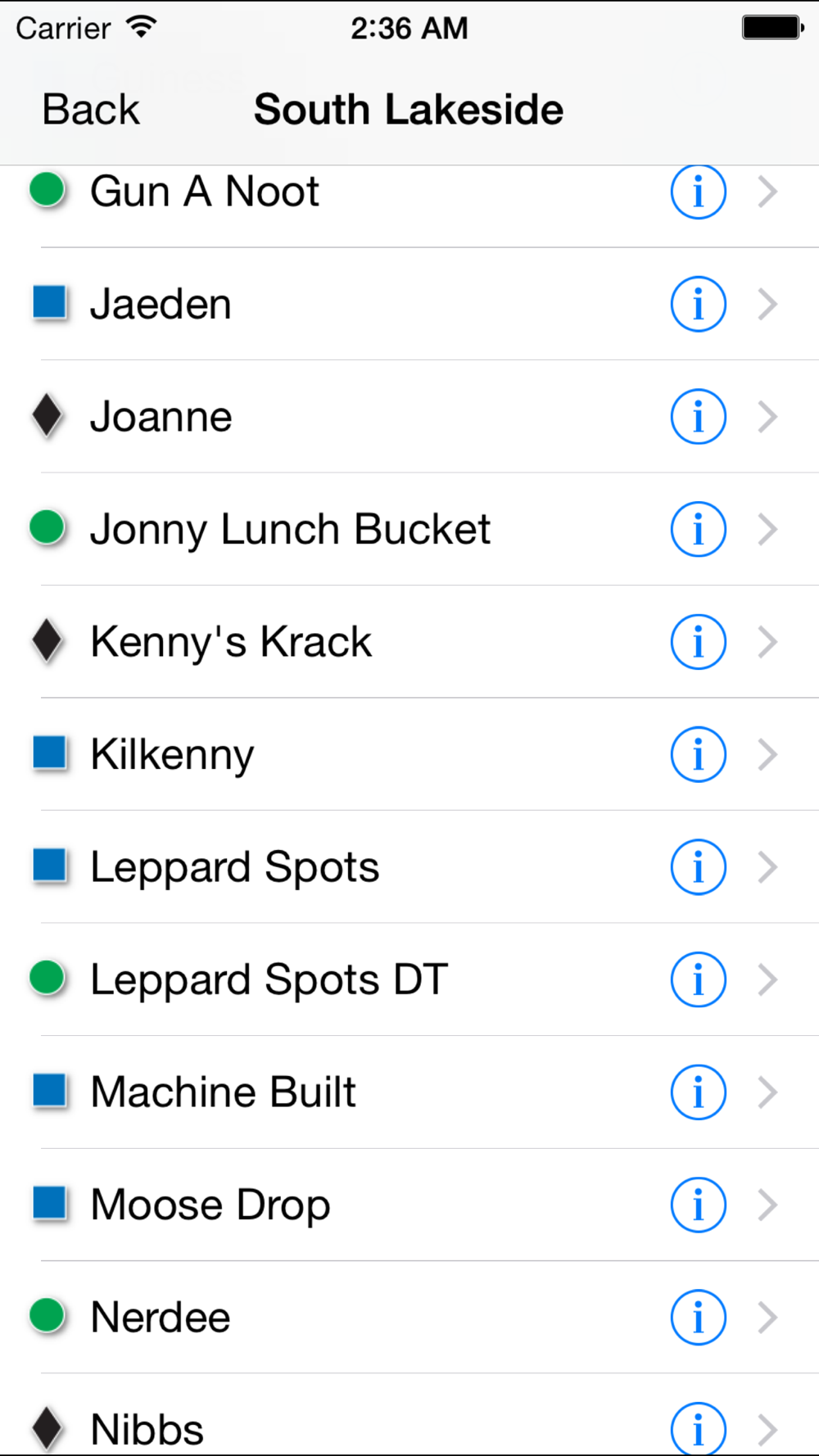 -info buttons along each trail open the trail description page and can be toggled on and off